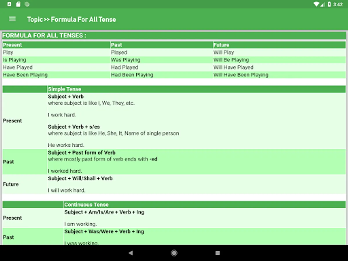 - Tenses : Simple Present Tense, Present Continuous Tense, Present Perfect Tense, Simple Past Tense, Past Continuous Tense, Past Perfect Tense, Future Tense, etc.