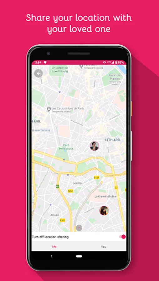 Share live location with your partner and also track your partner's live location in real time. It also display the address where you both are.