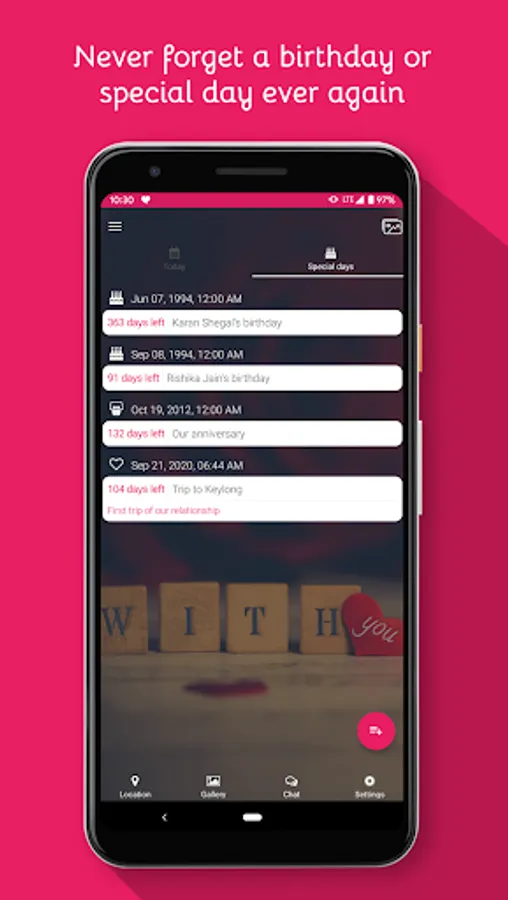 Check special days in WithU! There is even a feature that automatically calculates the count down for your special days.