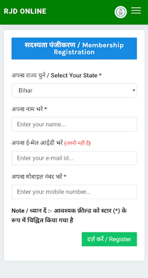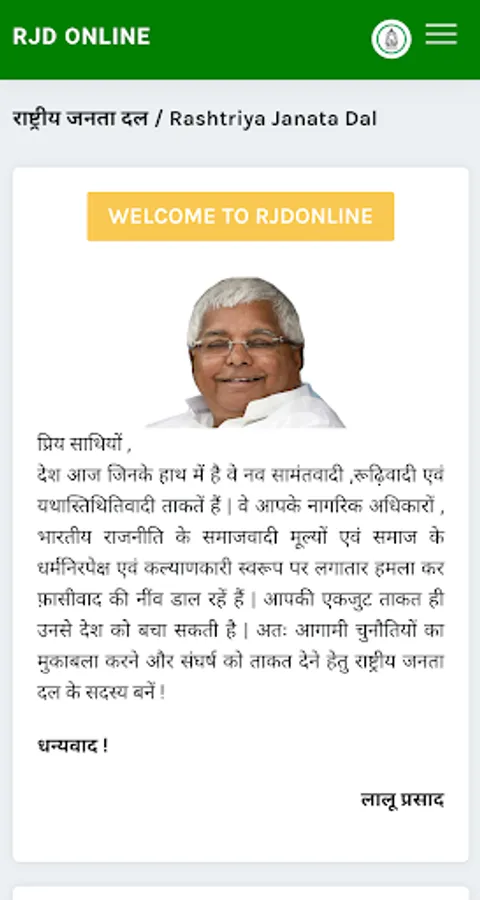 देश आज जिनके हाथ में है वे नव सामंतवादी ,रूढ़िवादी एवं यथास्तिथितिवादी ताकतें हैं | वे आपके नागरिक अधिकारों , भारतीय राजनीति के समाजवादी मूल्यों एवं समाज के धर्मनिरपेक्ष एवं कल्याणकारी स्वरूप पर लगातार हमला कर फ़ासीवाद की नींव डाल रहें हैं | आपकी एकजुट ताकत ही उनसे देश को बचा सकती है | अतः आगामी चुनौतियों का मुकाबला करने और संघर्ष को ताकत देने हेतु राष्ट्रीय जनता दल के सदस्य बनें !