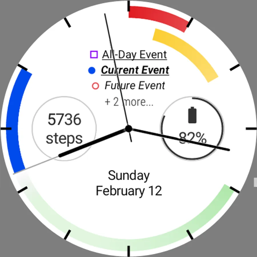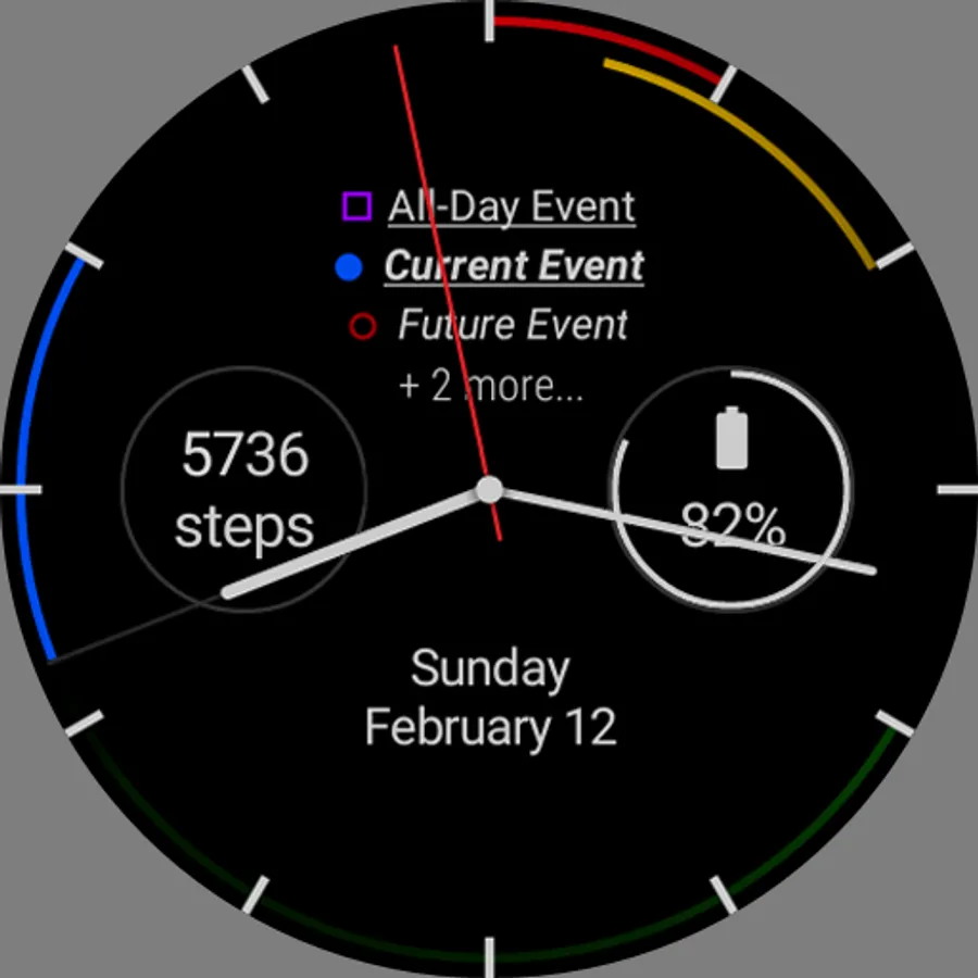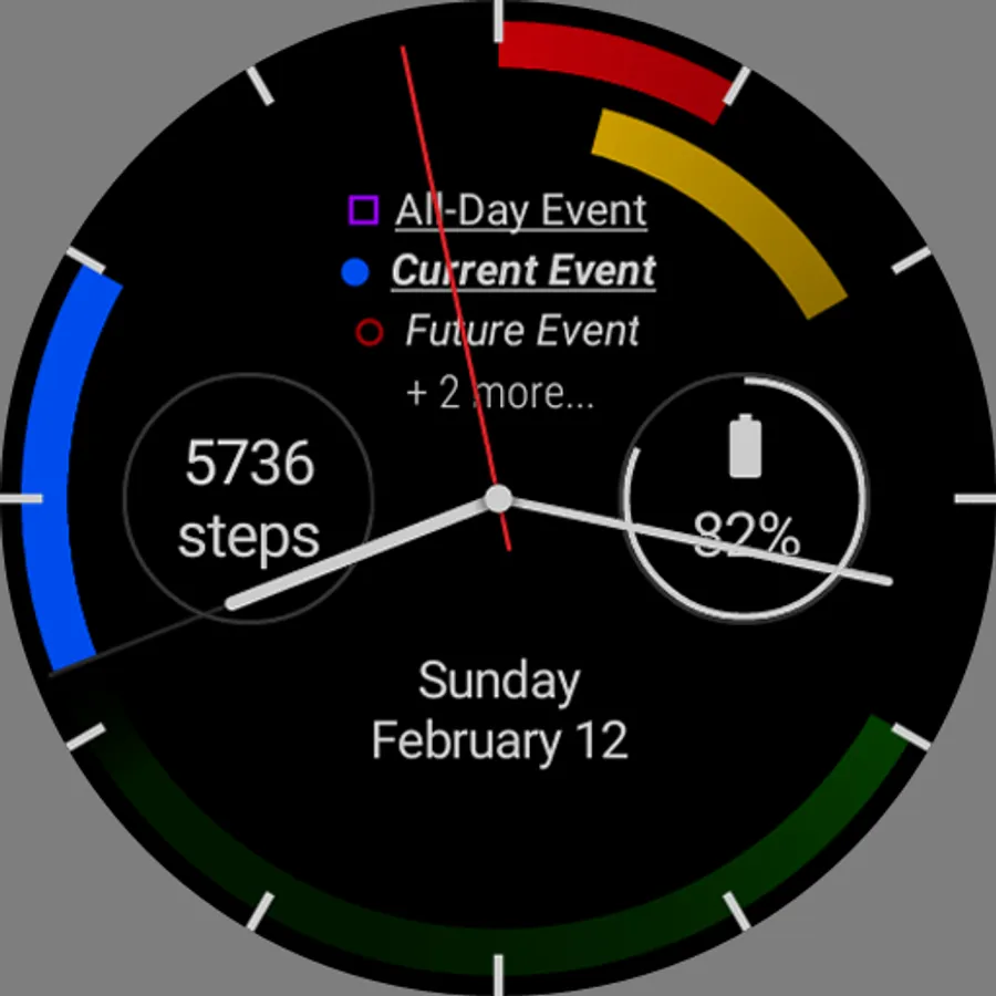 Using arcs colored from the event colors on your Google Calendar, First displays your agenda of meetings, events, and all-day events in a stylish and functional manner. First is designed to handle events even as long or longer than 12 hours with grace. NOTE: this requires accepting the calendar permission upon installation, and it can take up to 15 minutes for calendar events to sync to your watch.