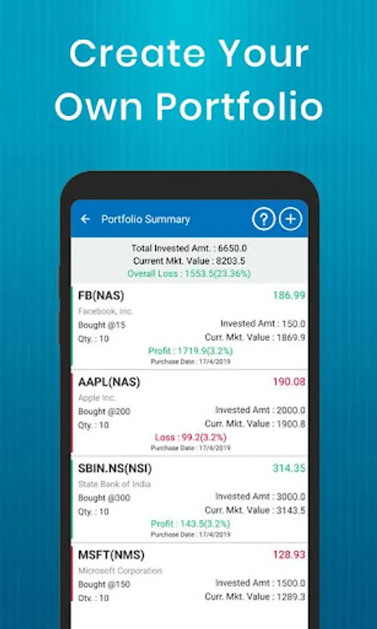 - Create your own customized portfolio as a personal tracker to add the ticker and monitor your investment of favorite stocks.