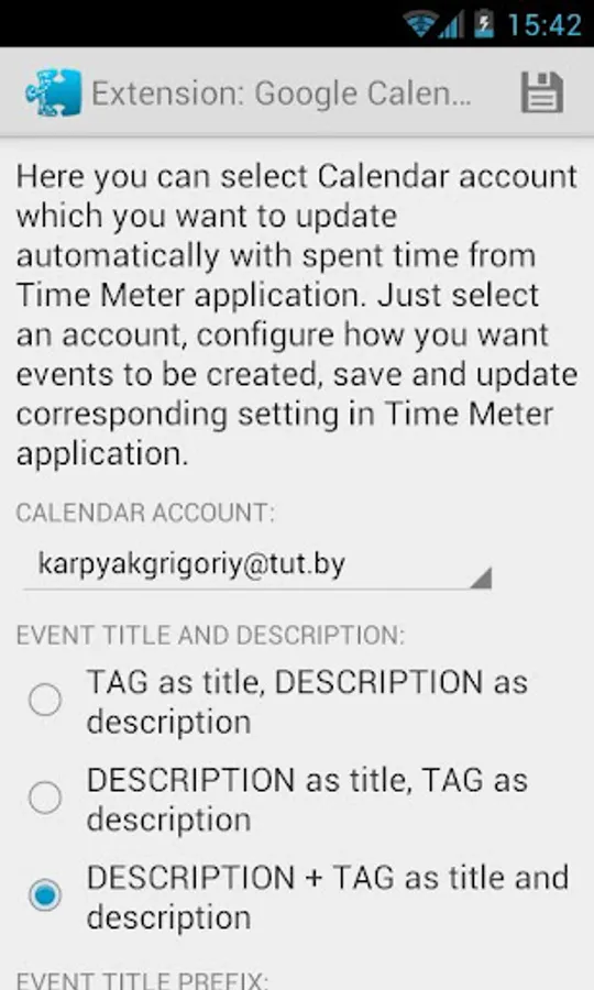 • Google Calendar support (since Android 4.0) - allows you to automatically update Google Calendar from Time Meter application when you PAUSE or STOP time tracking. This can be extremely useful when you work as a freelancer or just want organize and manage your time. It allows you to review all time you tracked from the handy web interfaces provided by Google (Gmail/Calendar), Microsoft (Outlook) or other "calendar providers".