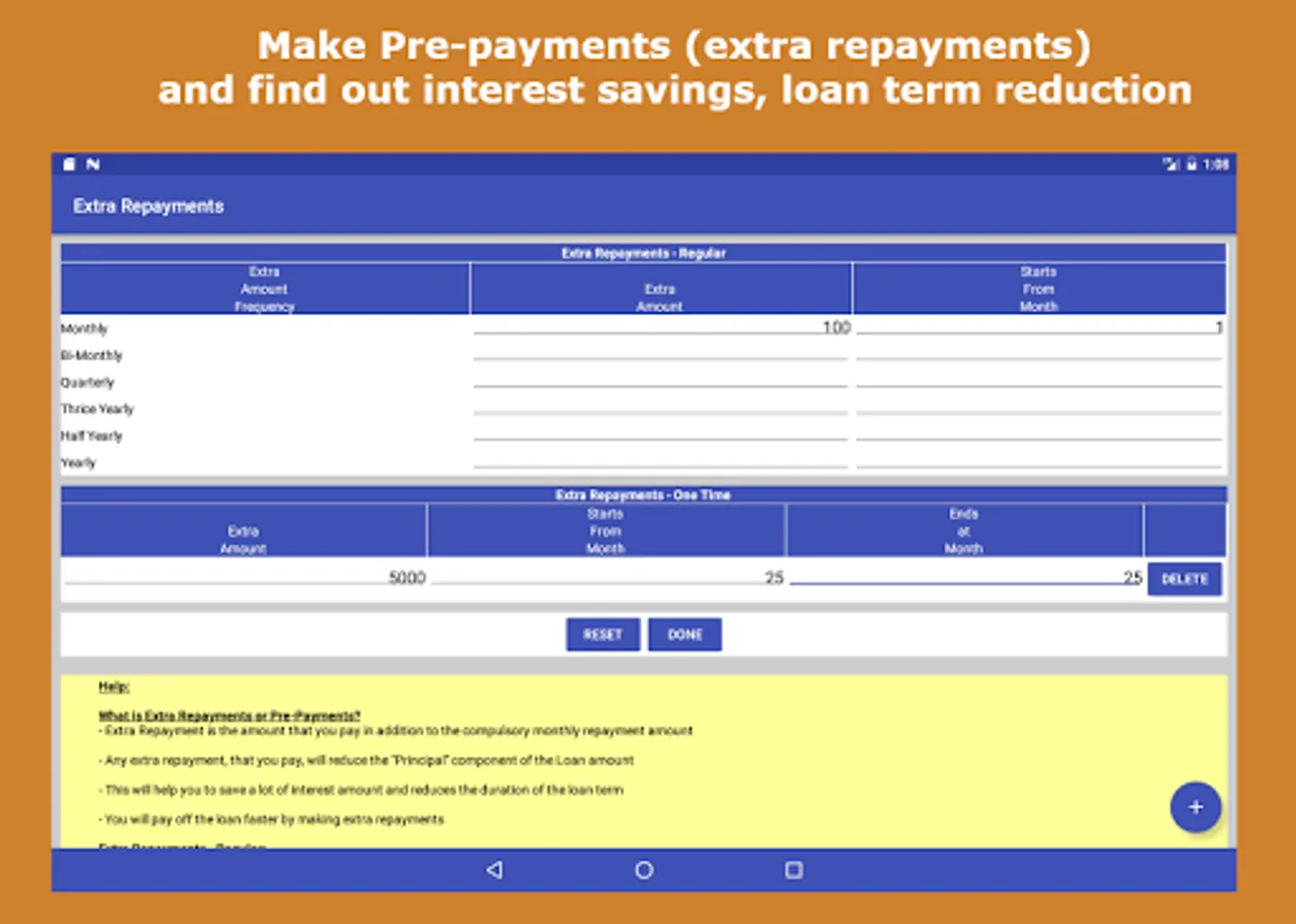 * Make Pre-payments (Extra Repayments) and find out interest savings, loan term reduction