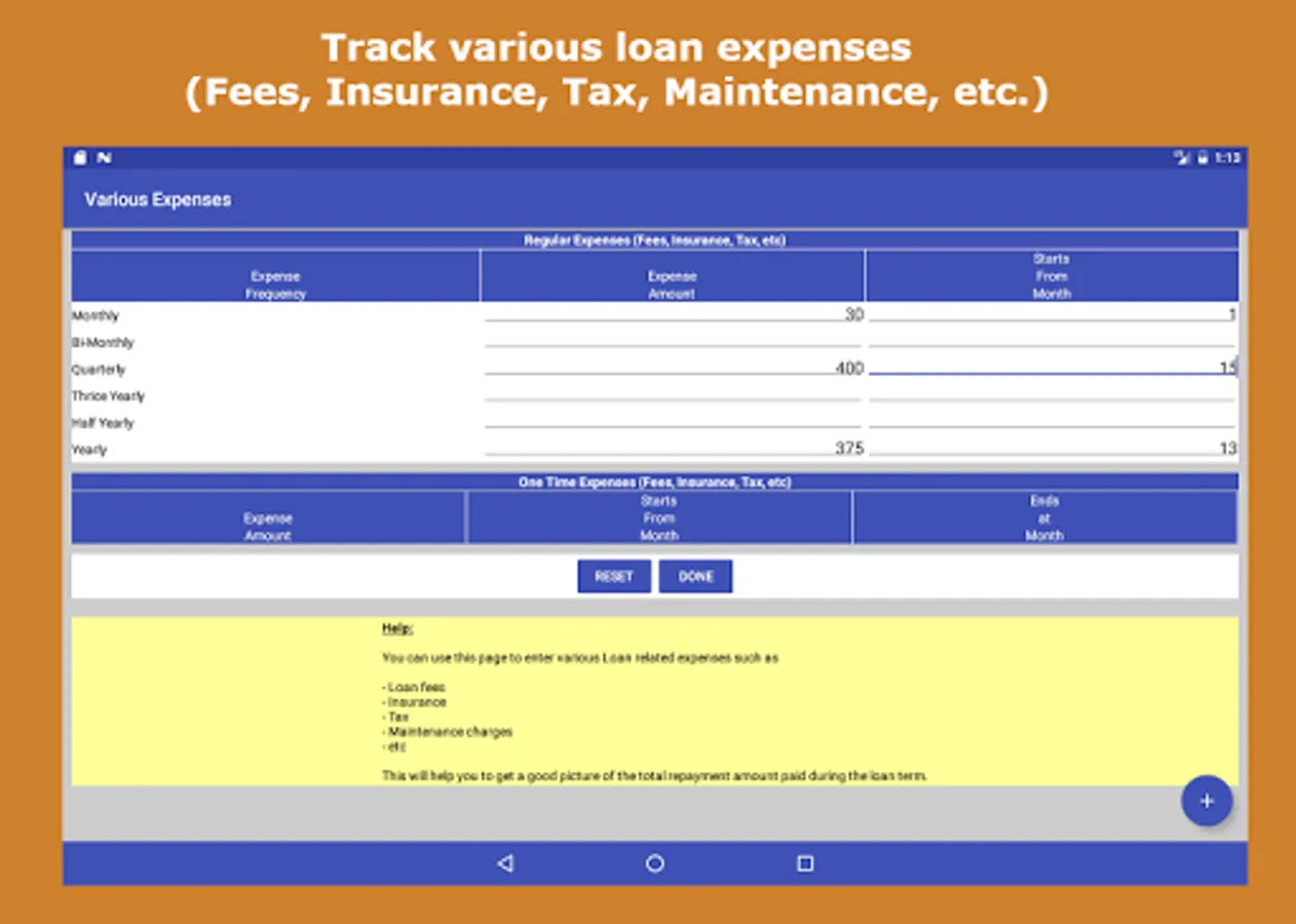 * Track various Loan expenses such as Fees, Insurance, Tax, Maintenance charges, etc