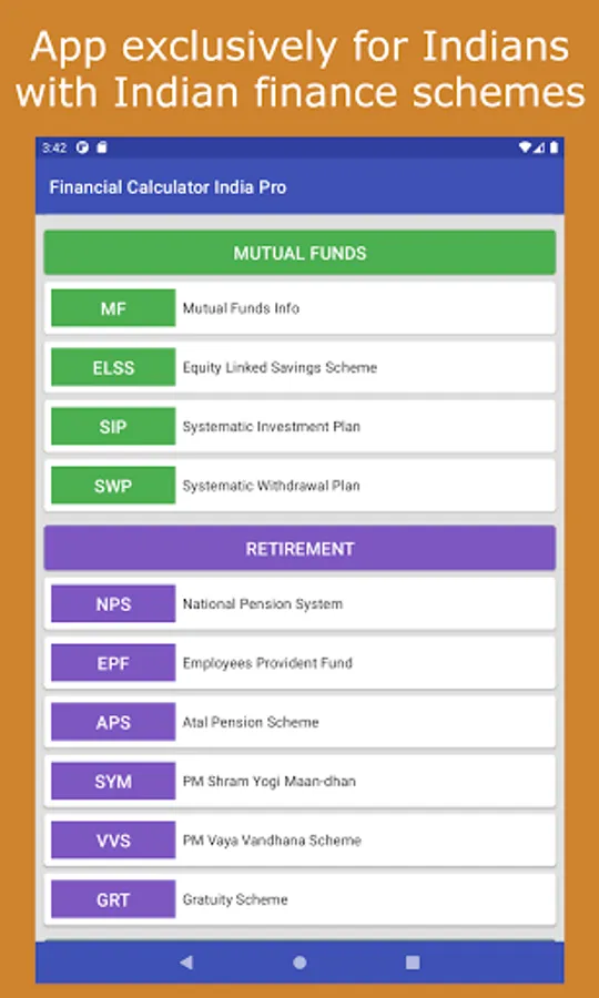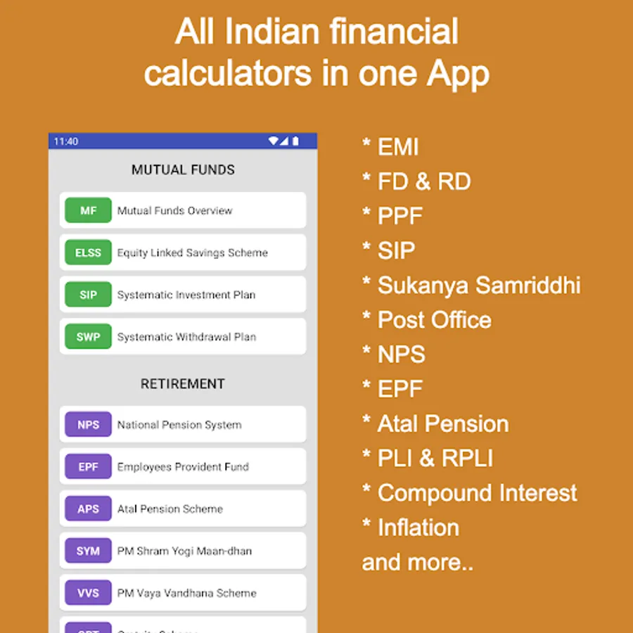 A financial calculator exclusively for Indians with the schemes available in Indian Banks, Post Office, Mutual Funds, Retirement, Income Tax, Insurance, Bonds and much more.