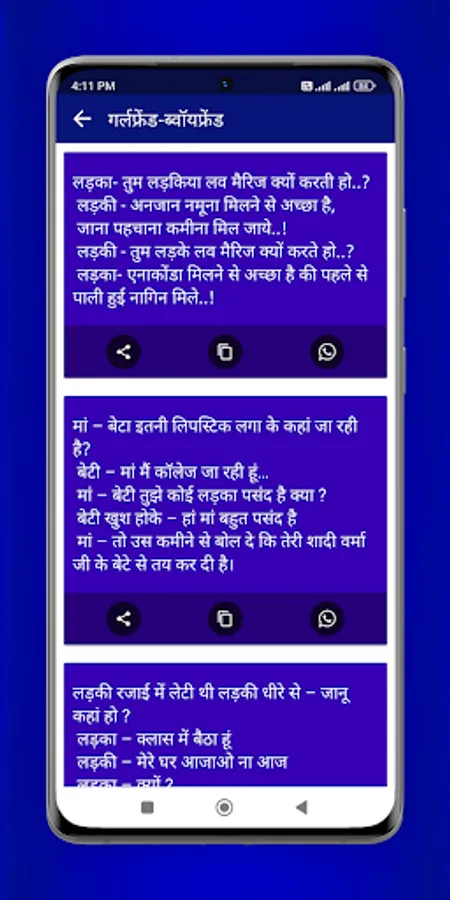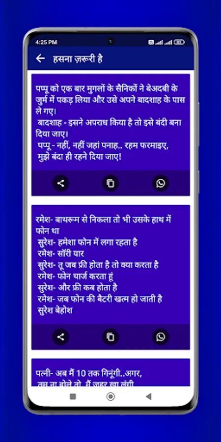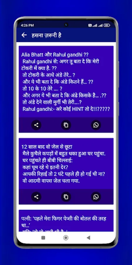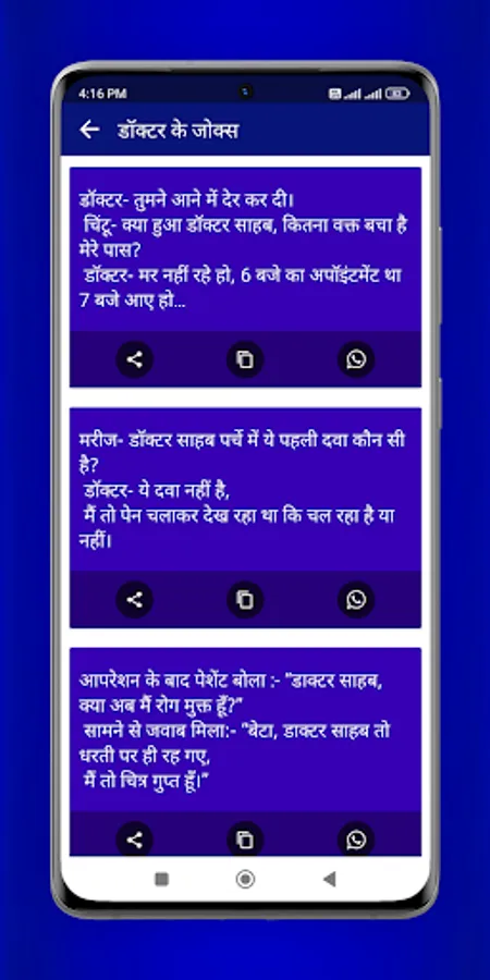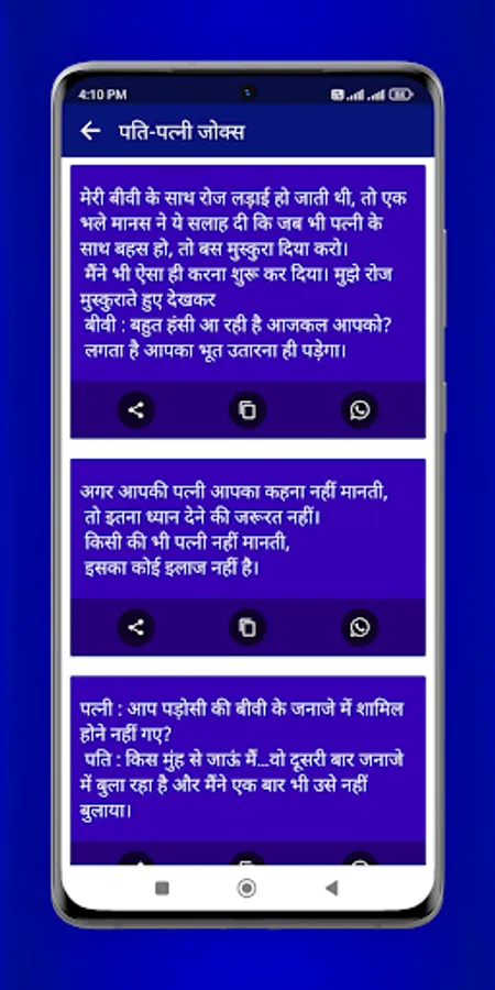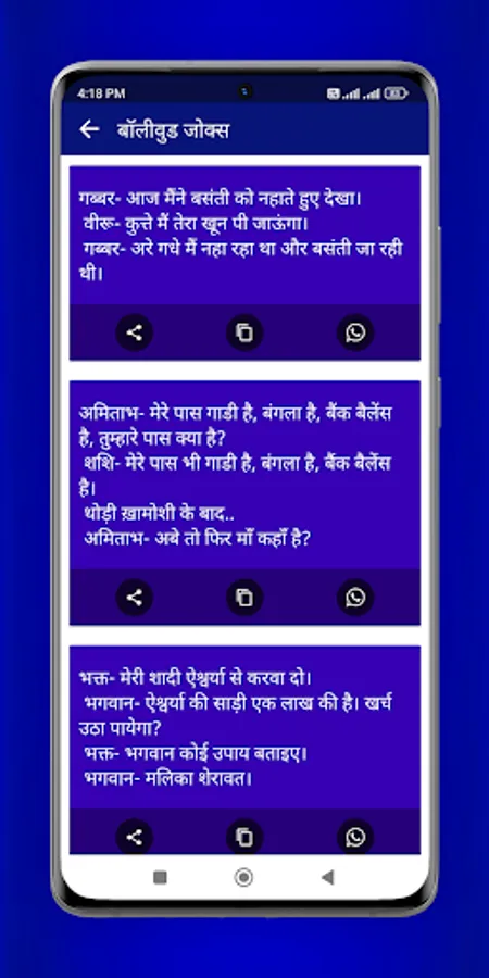 Hindi Jokes can be shared with your WhatsApp Friends, Facebook Friends or any other social network friends. Hindi Jokes apps has thousands of funny hindi text jokes.