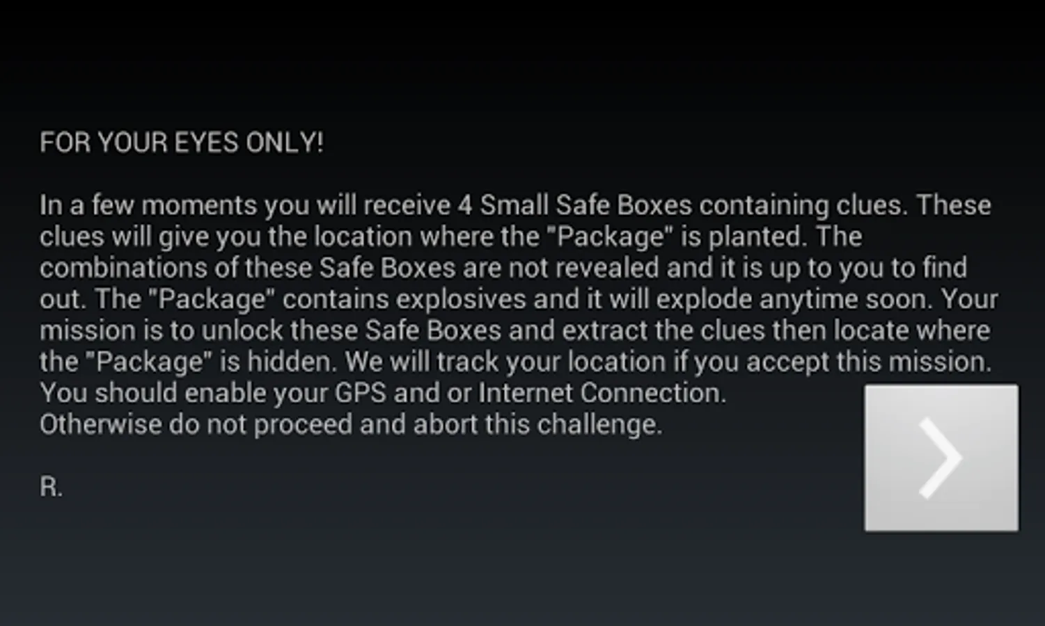 There will be 4 Safe Boxes that will be sent to your location and these boxes contains clues. Your mission is to unlock these safe boxes and decipher the clues inside.
