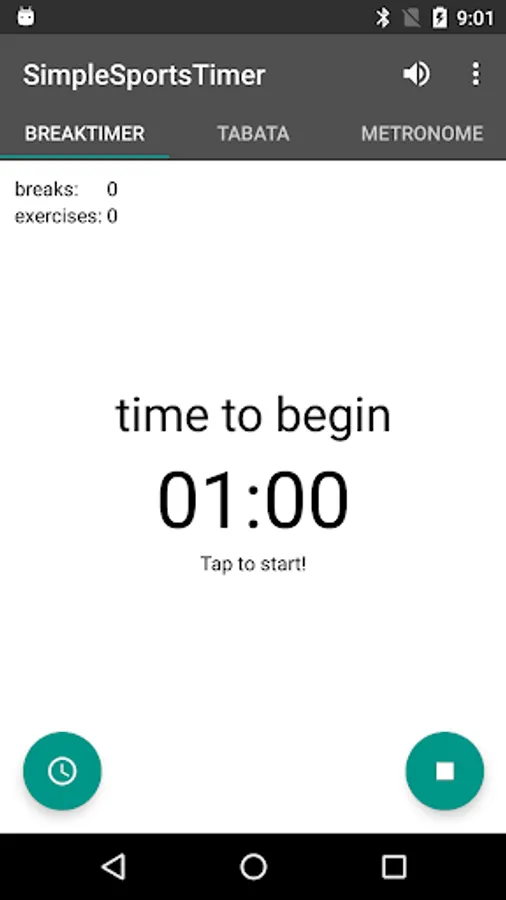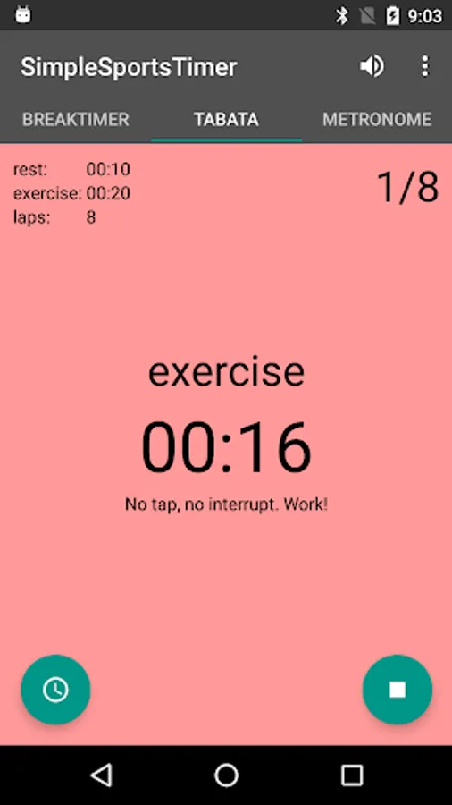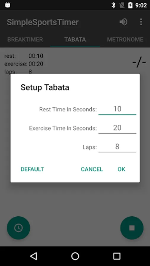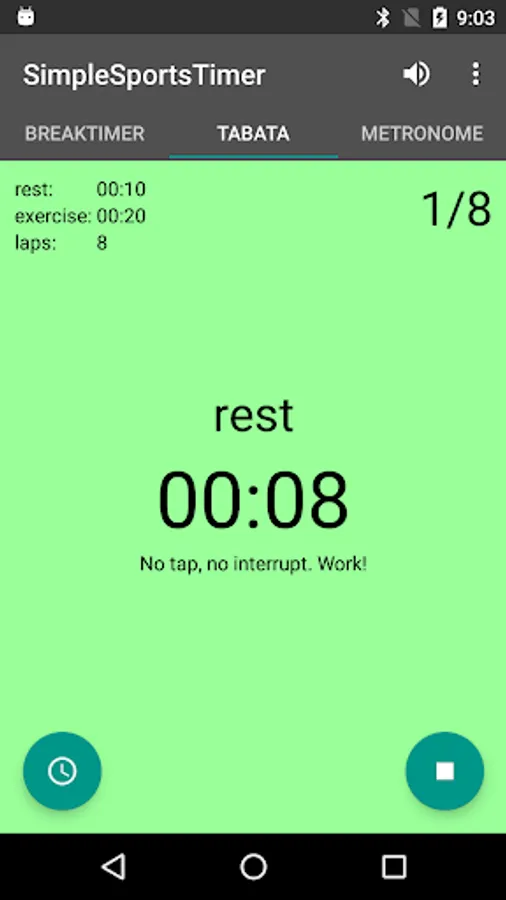 The Tabata Timer helps you comply with times for short, intense workouts. Specifications are break time, training time and number of sets.