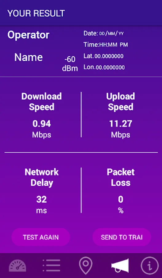 This application allows you to measure your data speed experience and sends the results to TRAI. The application captures and sends coverage, data speed and other network information along with device and location of the tests. The app does not send any personal user information. All results are reported anonymously. While this application gives TRAI details of your data experience, sending a report to TRAI does not constitute a complaint. In case of poor experience, users are requested to register a complaint with their network service providers.