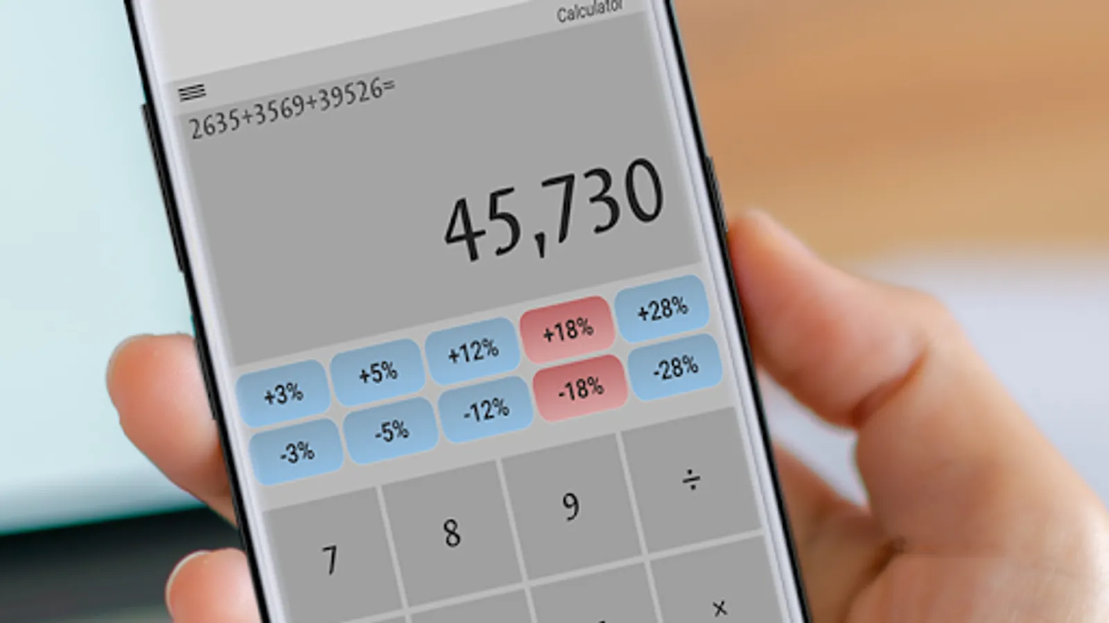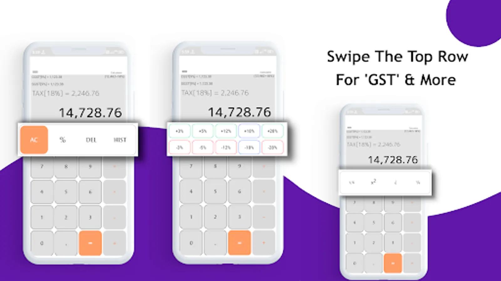 Simple to use GST (Goods and Services Tax) calculator with tax rates of (3%, 5%, 12%, 18%, 28%). Swipe the top button row to the right to access the gst buttons panel. Pressing any of the button from the panel will give you proper breakdown of (added or subtracted )Tax, CGST and SGST.