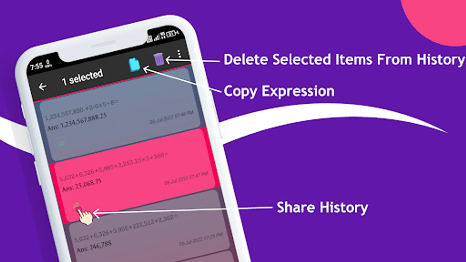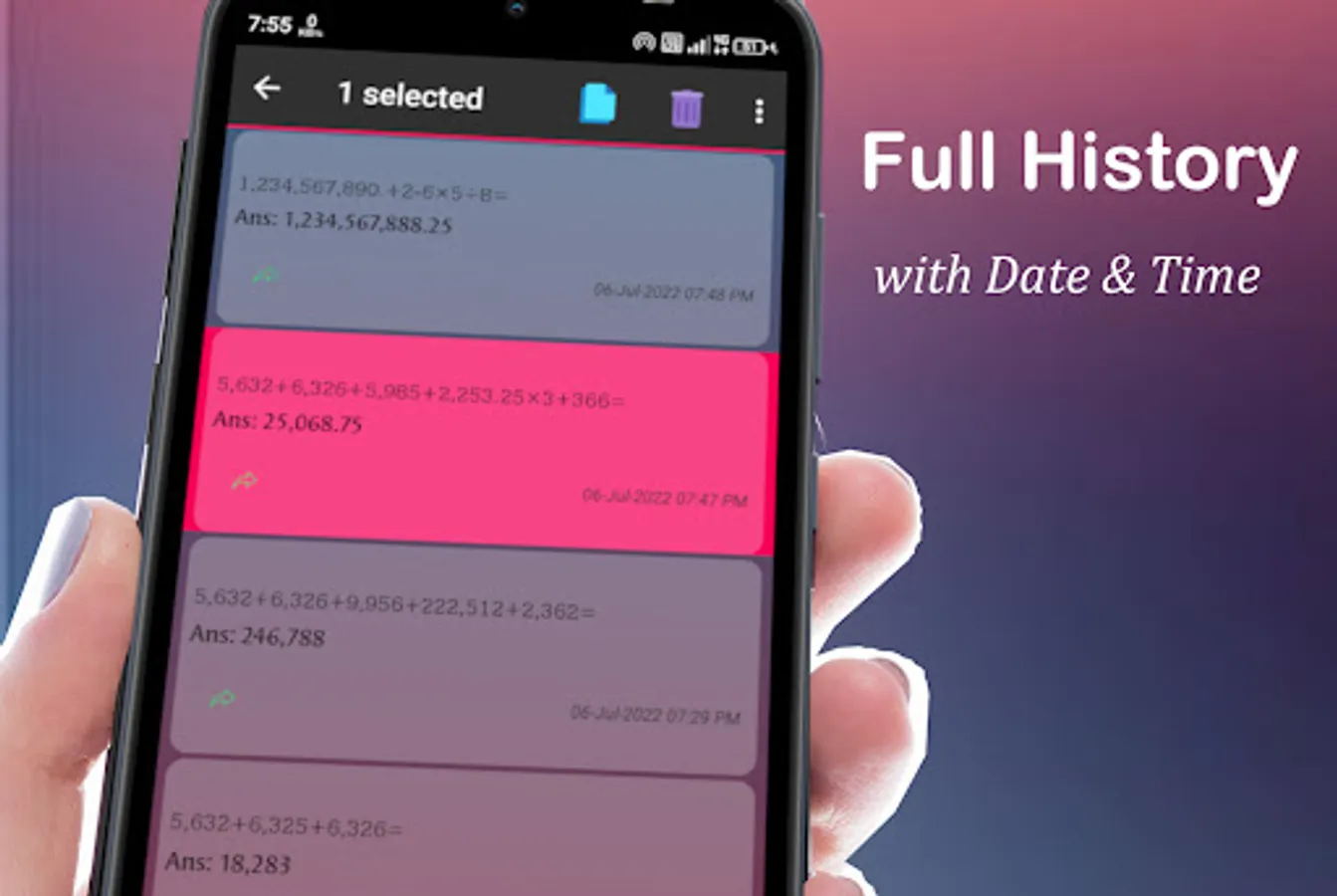 On pressing the '=' button each calculation will be saved to history with current date and time for your convenience. Access the history memory by pressing the 'Hist' button at the top right of the button row.