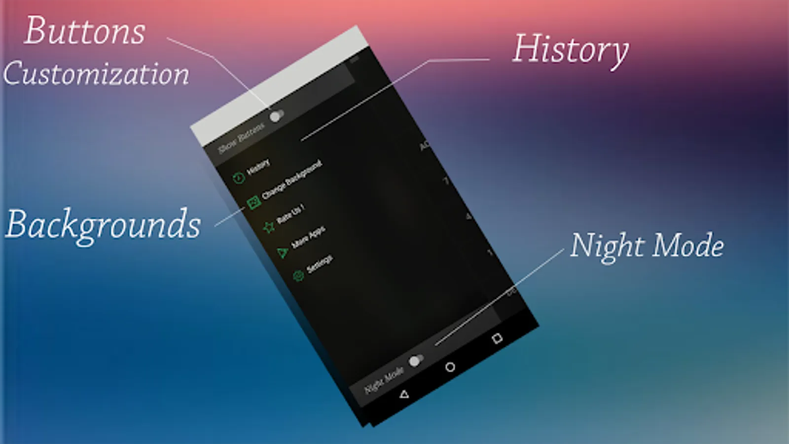 On the navigation menu you have the option of turning on/off button sound, switching between normal and night mode and accessing the app setting.