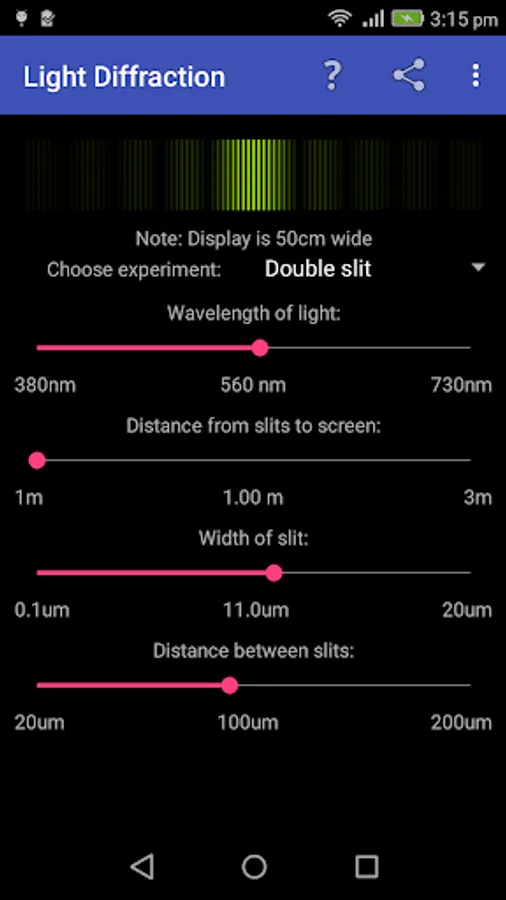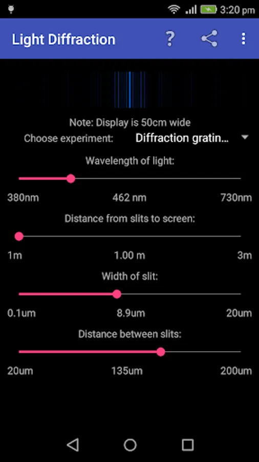 - Distance between slits (Diffraction grating and double slit experiments only)