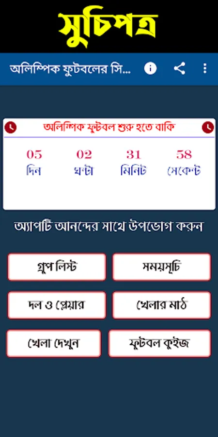 অলিম্পিক ফুটবলের সময়সূচি এই অ্যাপটি অনেক সুন্দরভাবে সাজানো হয়েছে। আপনি এখান থেকে খুব সহজে খেলার দিন তারিখ জেনে নিতে পারবেন। কোনো প্রকার ঝামেলা ছাড়াই। আমাদের এই অ্যাপটিতে নতুন নতুন ফিচার যোগ করা হয়েছে।