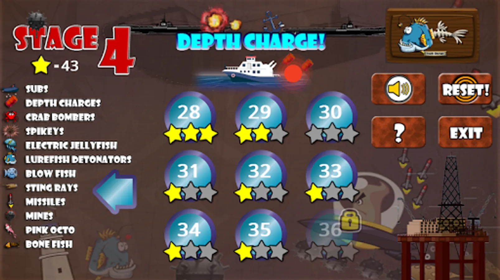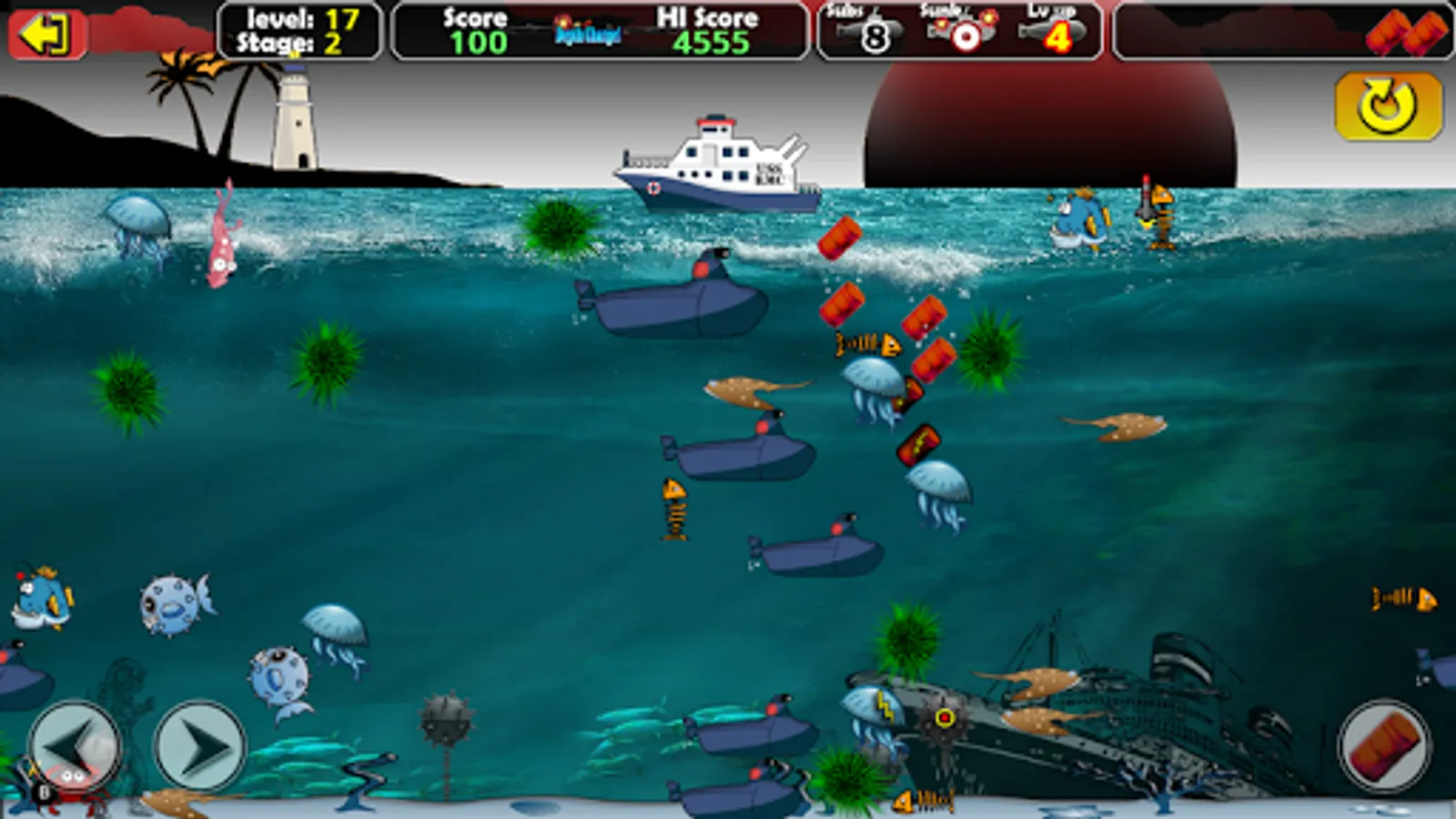 Timing is key. Drop your depth charges in the paths of the subs to destroy them.