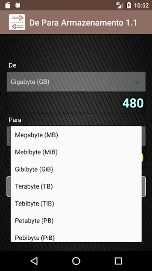 Storage unit conversion tool: Bit, Kilobit, Kibibit, Megabit, Mebibit, Gigabit, Gibibit, Terabit, Tebibit, Petabit, Pebibit, Byte, Kilobyte, Kibibyte, Megabyte, Mebibyte, Gigabyte, Gibibyte, Terabyte, Tebibyte, Petabyte and Pebibyte.