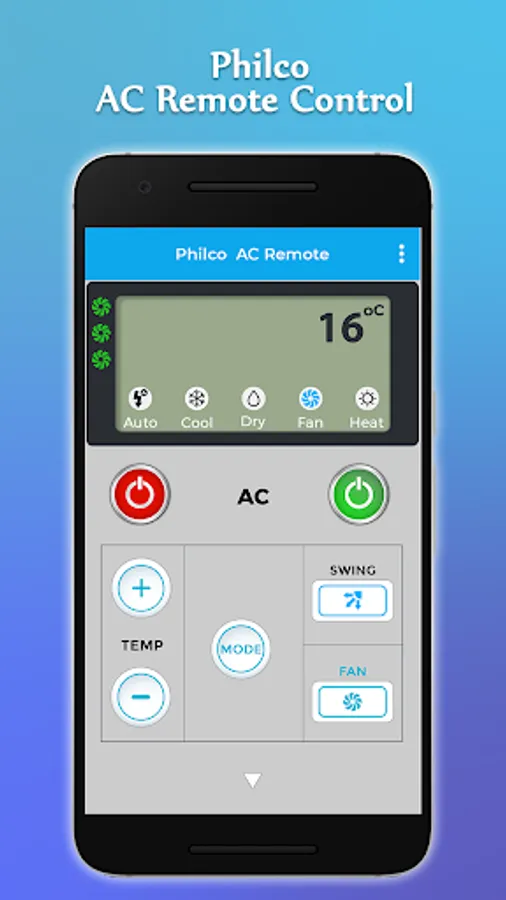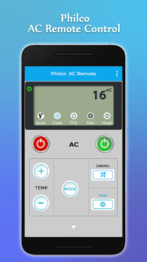 Just install Philco AC Remote Control this app and start to change AC temperature with a mobile app. This app has all features like easily increase or decrease Temperature of AC, Change swing option, Change fan speed functions, or also change modes.