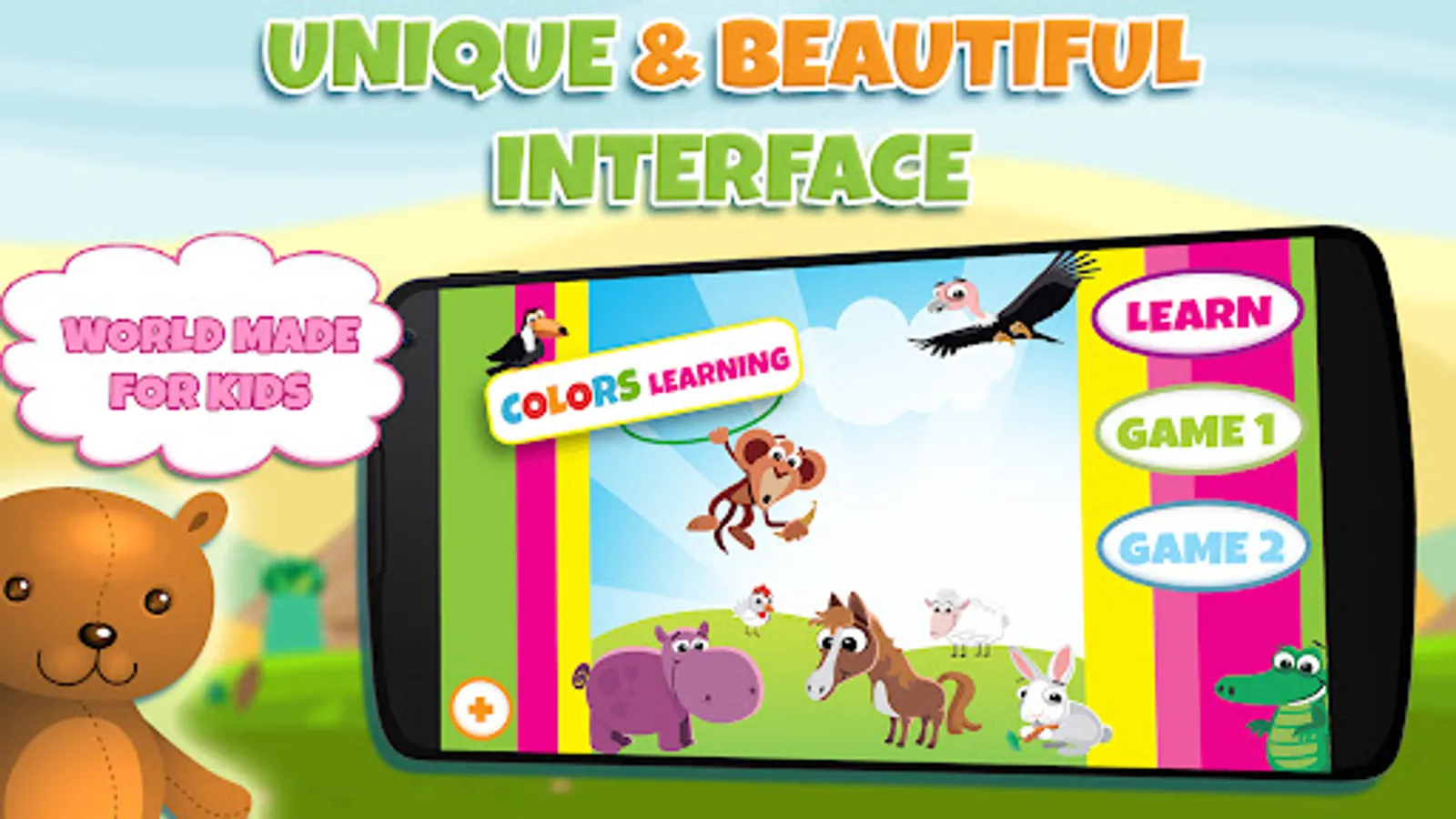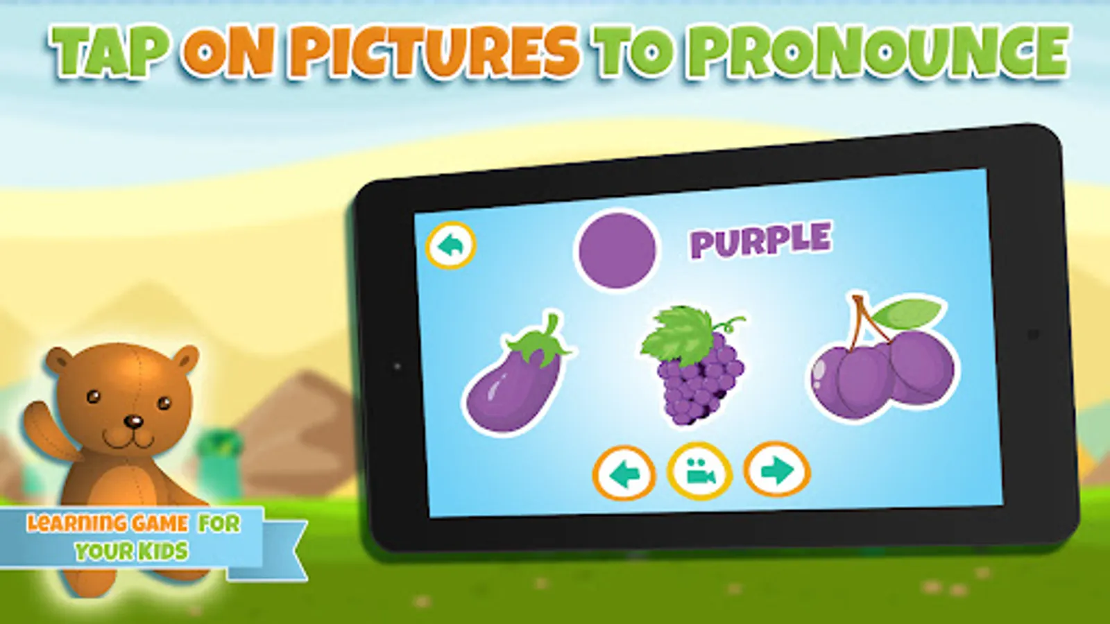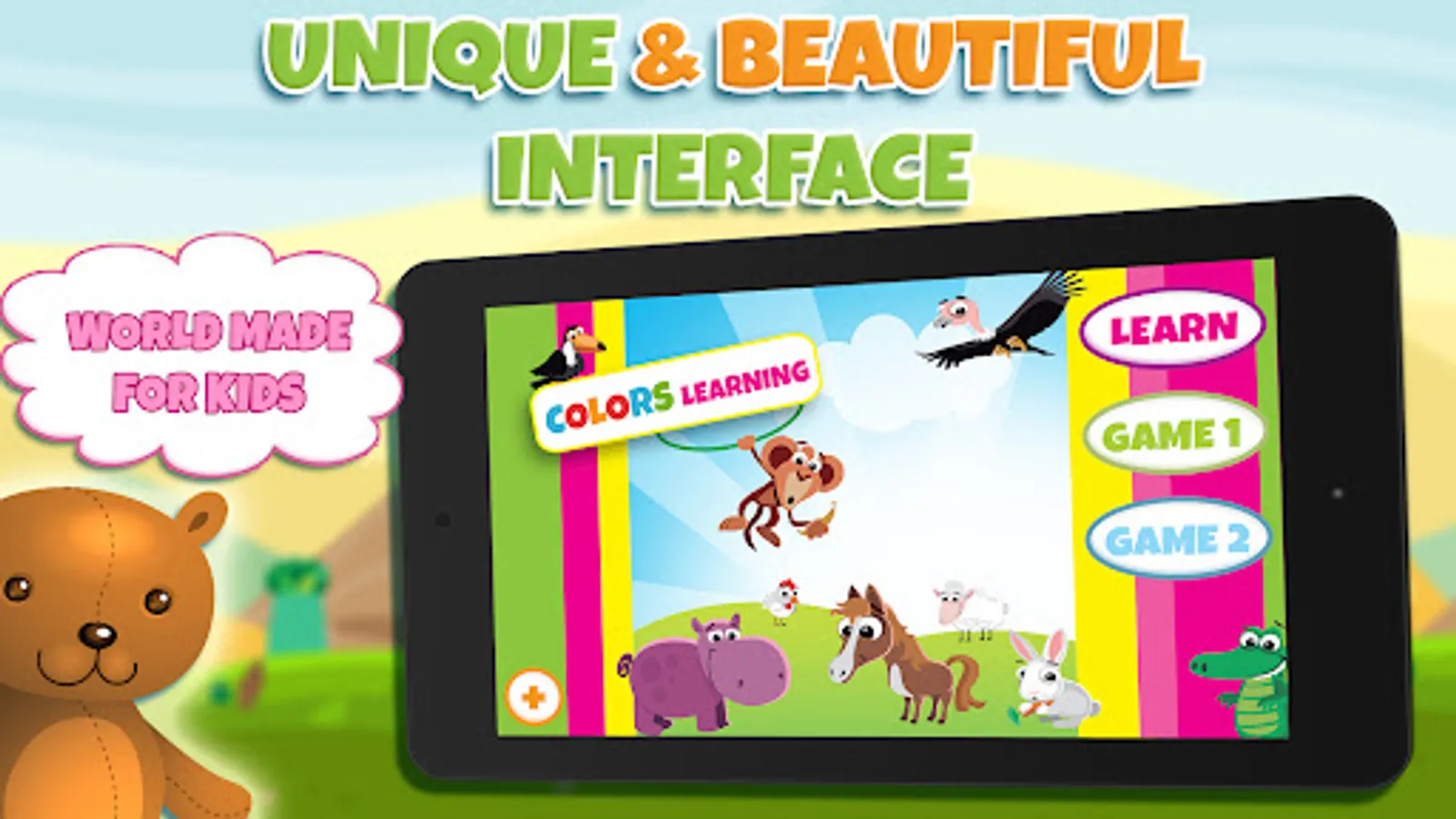 - Learning colours button of this learning game for toddlers is of course for learning colors. When you enter a certain color, along with its name will be shown and pronounced nice picture. Below the color three objects will appear to match the color. For example bear, deer, monkey matches brown color. This makes this family game funny and entertaining. When you click on any object it will be pronounced in nice girls voice in english language so your kid or toddler will learn english language as well and that is why this colors learning is also english learning game.