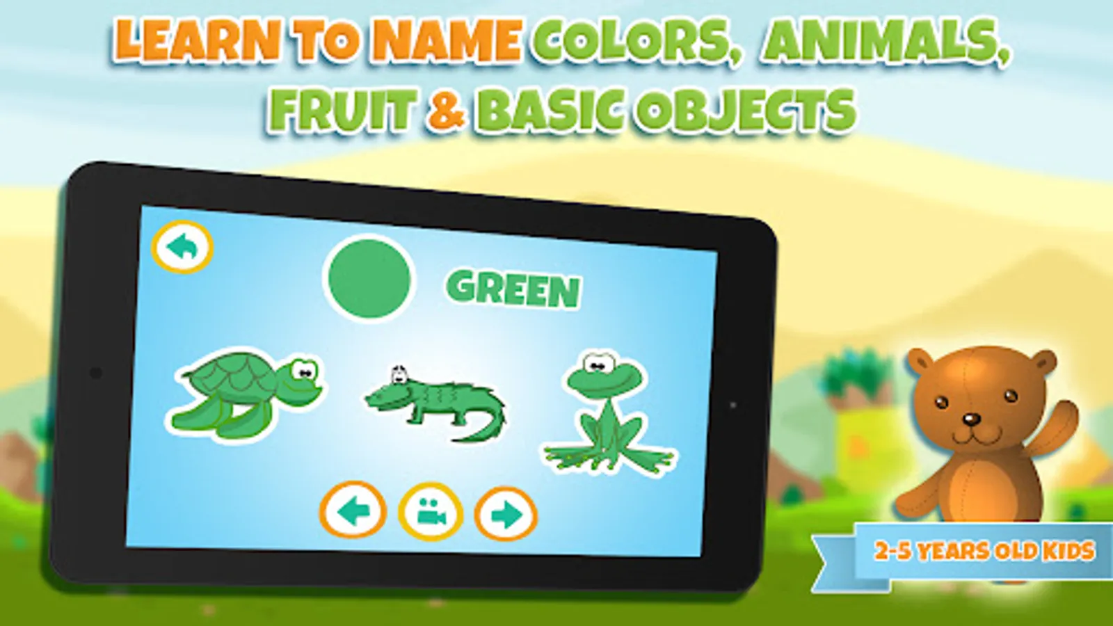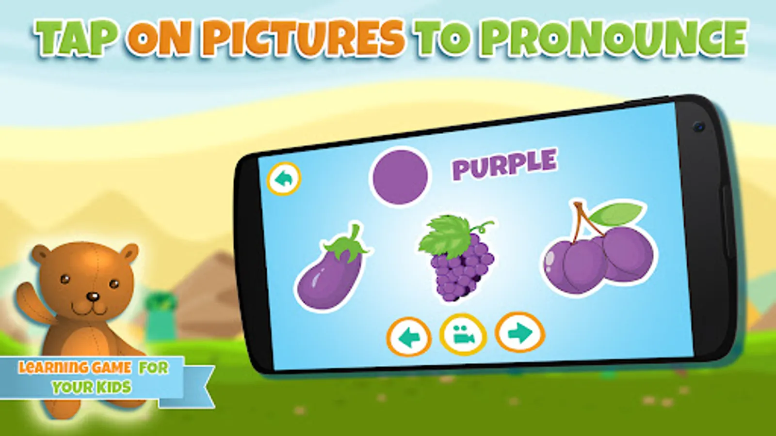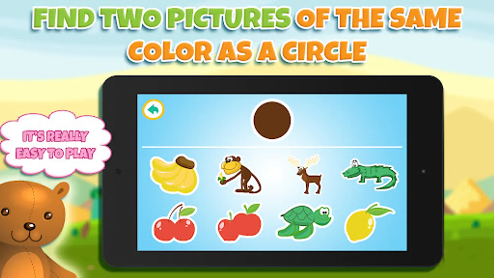 - Learning colours button of this learning game for toddlers is of course for learning colors. When you enter a certain color, along with its name will be shown and pronounced nice picture. Below the color three objects will appear to match the color. For example bear, deer, monkey matches brown color. This makes this family game funny and entertaining. When you click on any object it will be pronounced in nice girls voice in english language so your kid or toddler will learn english language as well and that is why this colors learning is also english learning game.