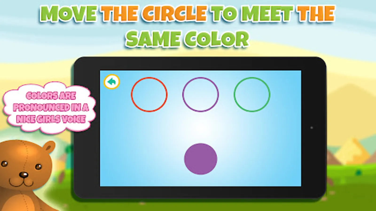 - Game one is for matching colors. Children (boy or girl) have to match the circle to the same colored circle. When your kid or baby will match the color correctly the color will be pronounced in english.
