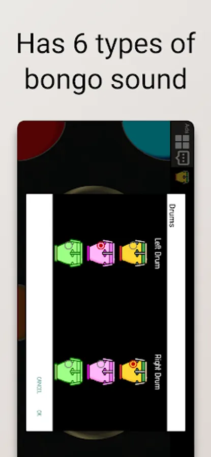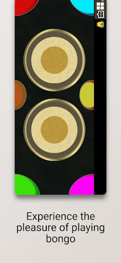 In this program, there are two types of simulated percussion instruments including conga and bongo, each of which has 3 parts and 3 sounds of conga and bongo percussion instruments, and there are various pads in the margins of the screen that include the sound of percussion instruments.