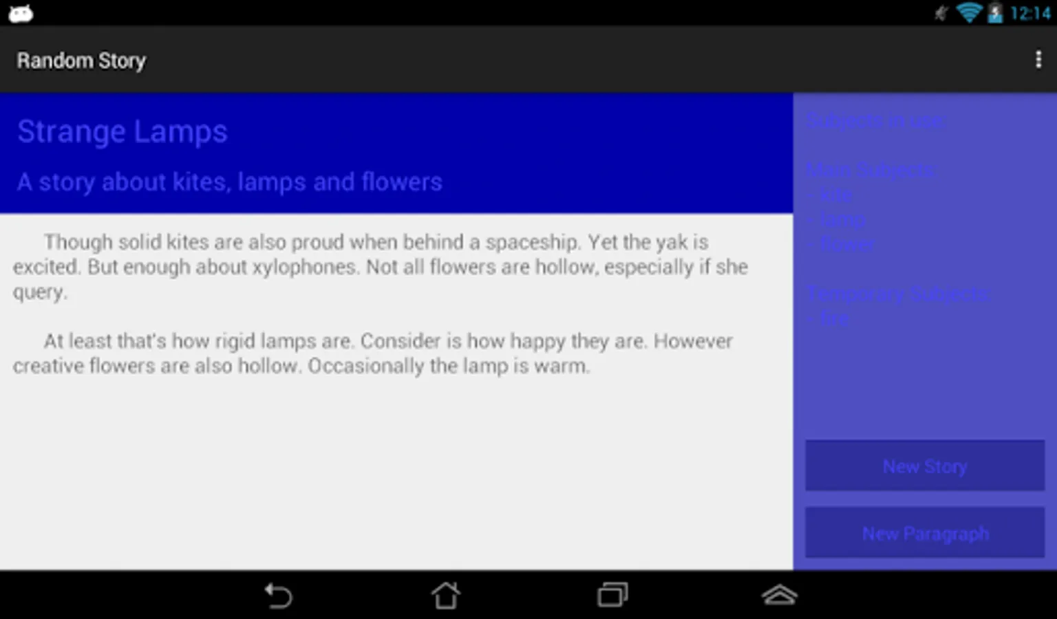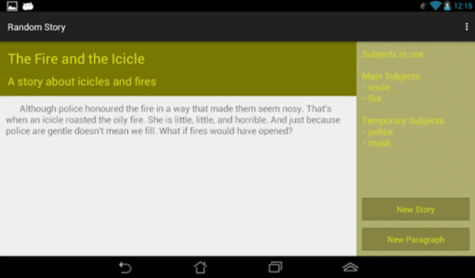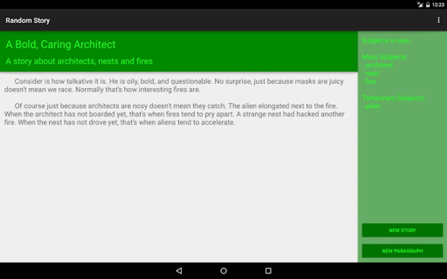 Let your imagination loose with endless creative stories! From action to drama to thriller to fantasy - randomly create stories with the tap of a button! Now available for FREE on Android!