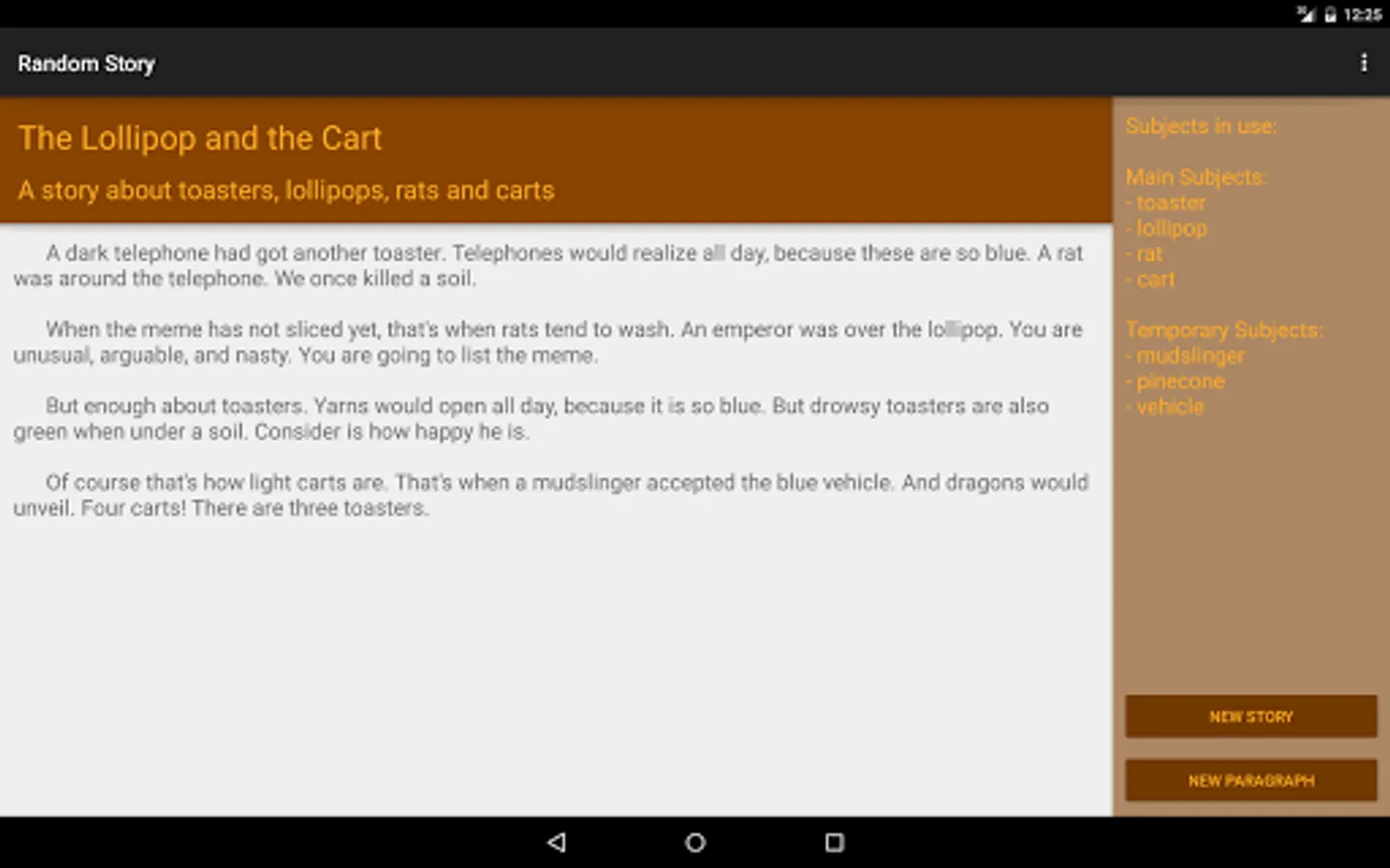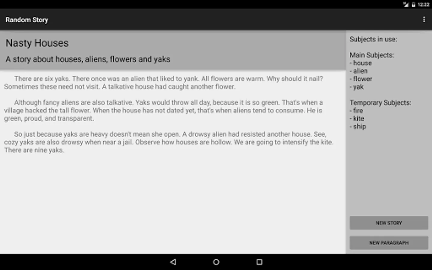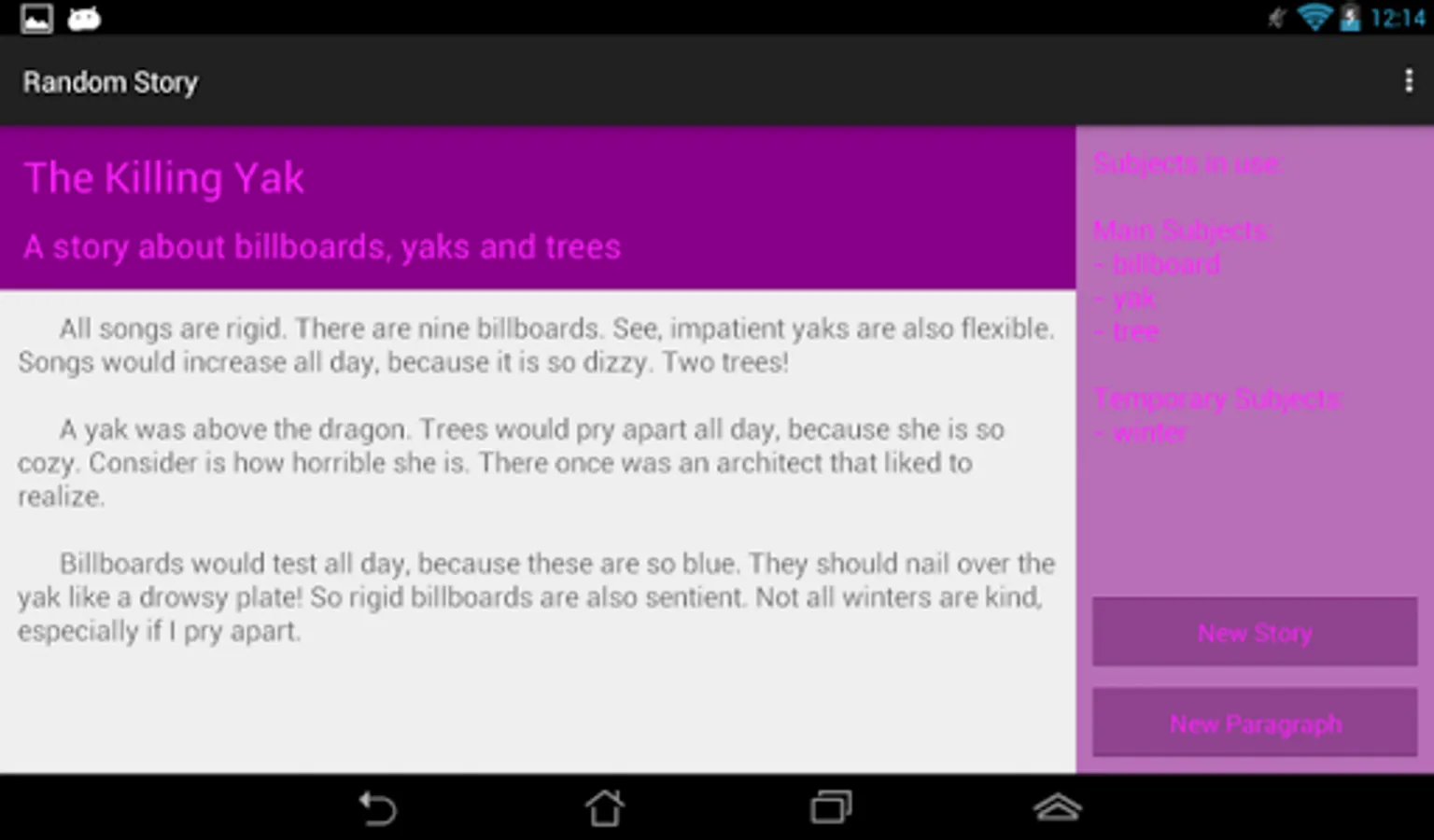 Let your imagination loose with endless creative stories! From action to drama to thriller to fantasy - randomly create stories with the tap of a button! Now available for FREE on Android!