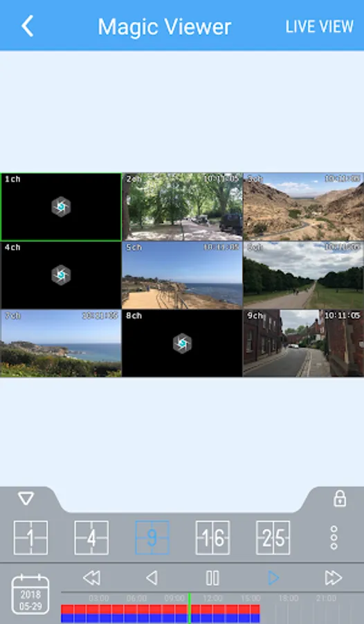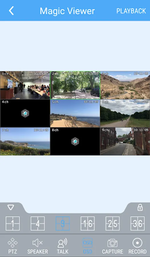 - Live Channels – 1 / 4 / 9 / 16 / 25 / 36 display mode