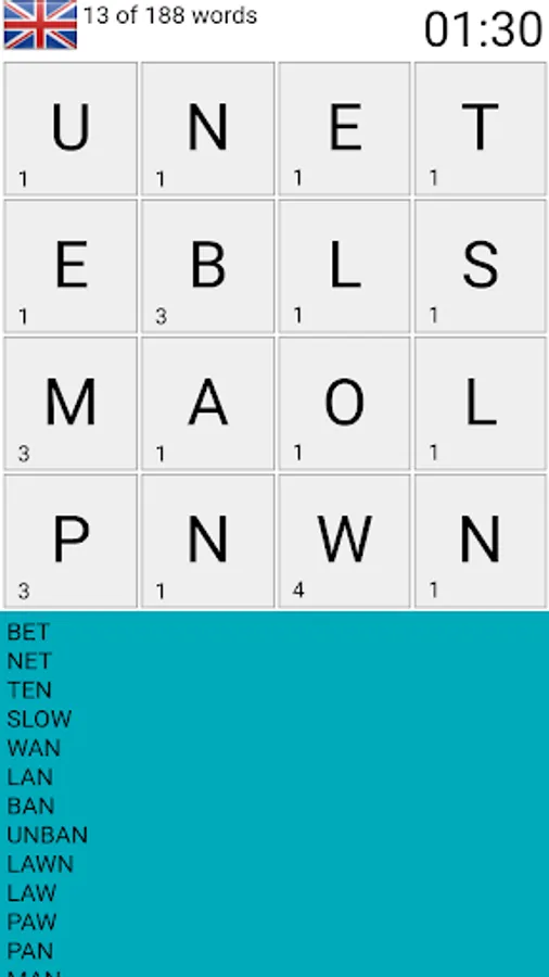 Find as much words as possible during the available time on a 4x4 grid. Play simultaneously with hundreds of players all over the world and reach the #1 high-score.