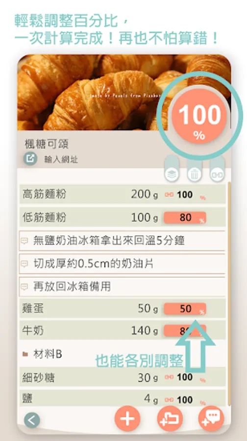 3. 調整百分比:若是原始食譜不符合自己想做的份量,直接調整百分比,一次計算完成,不必再挨個算。
