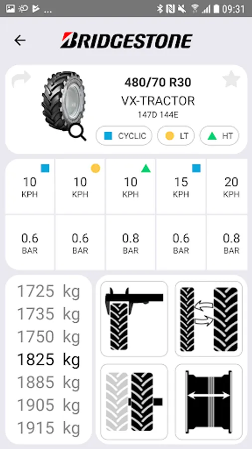 A utility application used for calculating tyre pressure in order to obtain optimal safety and efficiency when employing Bridgestone agricultural tyres.