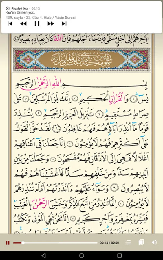 - Listening to audio recordings from the Quran, Hizb-ül Hakaik and Risale-i Nur over the internet with or without downloading