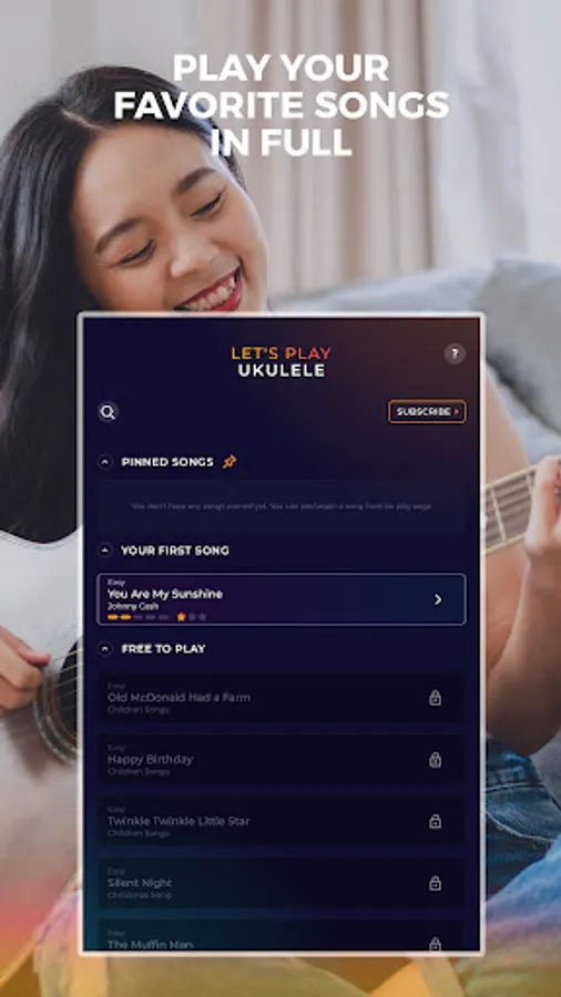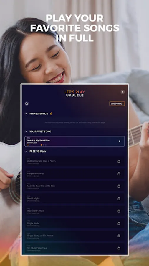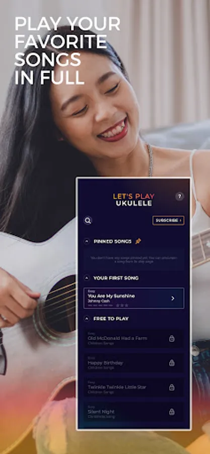 You can learn guitar or Ukulele effortlessly while playing your favorite tunes! Choose from our growing list of popular guitar and ukulele songs like: