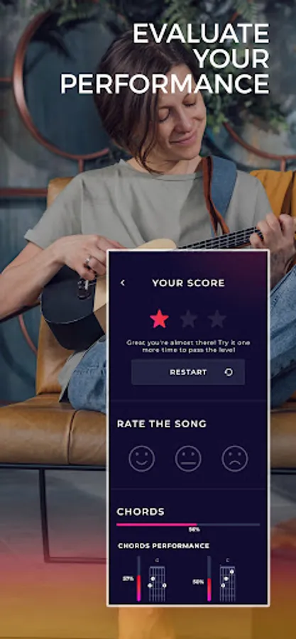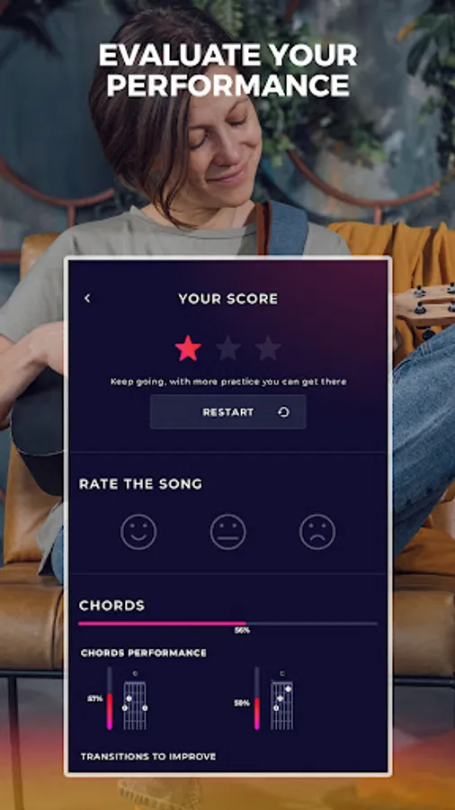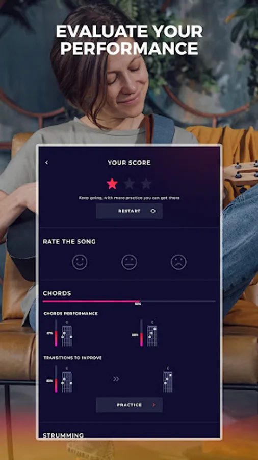 • Get instant feedback with your overall score, rhythm score, and chords score to know what you need to continue practicing