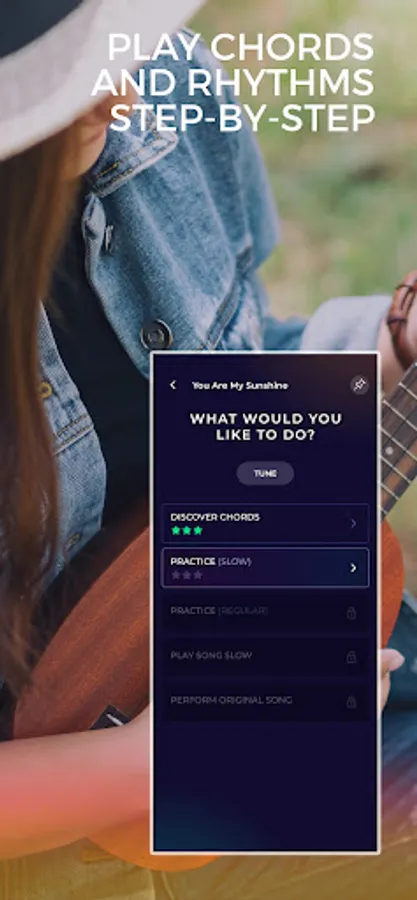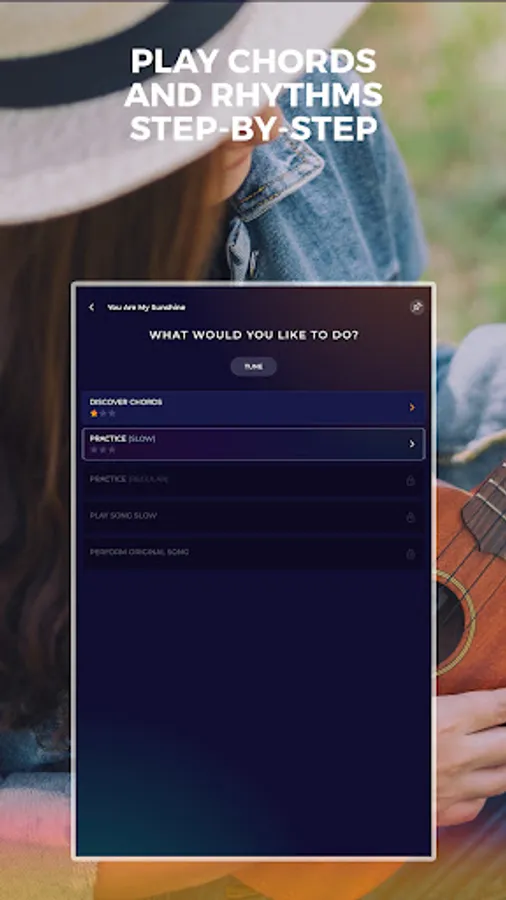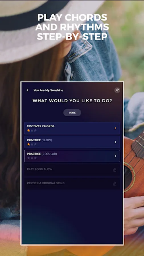Roadie Coach’s simple interface makes it fun to learn guitar and ukulele songs quickly and helps you progress one level at a time. Move through each of the stages of learning a song by perfecting your technique and crushing that song score.
