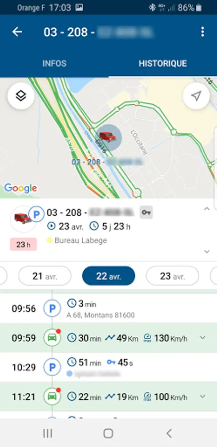You can find in your Mobile Link Road areas and addresses customers or suppliers, points of interest, receive your notifications and real-time alerts and access the individual journeys of each of your vehicles or trips to your vehicle groups.