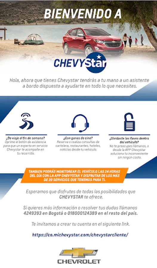 - Enter to https://co.michevystar.com/ChevystarCliente complete the form to create the account and then link your (s) vehicle (s) from the "My Account" option, or if you need help contact us from your vehicle (Help button) or phone: 01 8000 (1) 24389 (CHEVY) and 4,249,393 Bogota.