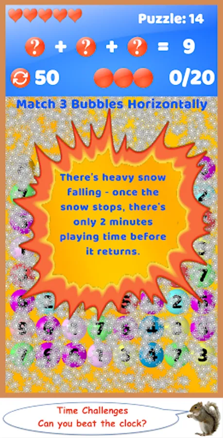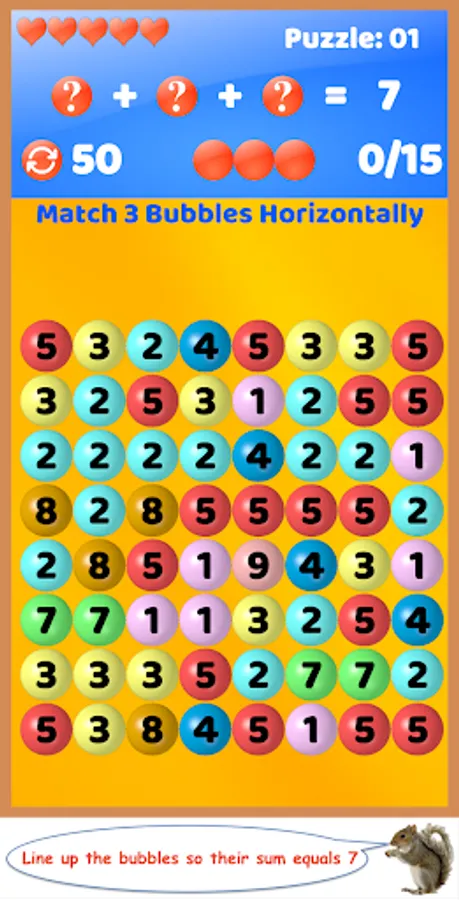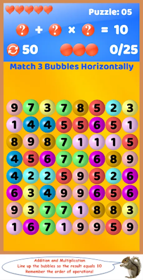 ★ Drag to swap adjacent bubbles in order to match 3 bubbles to give the required result either horizontally (from left to right) or vertically (from top to bottom) as directed.