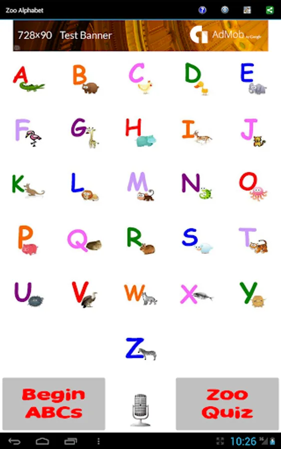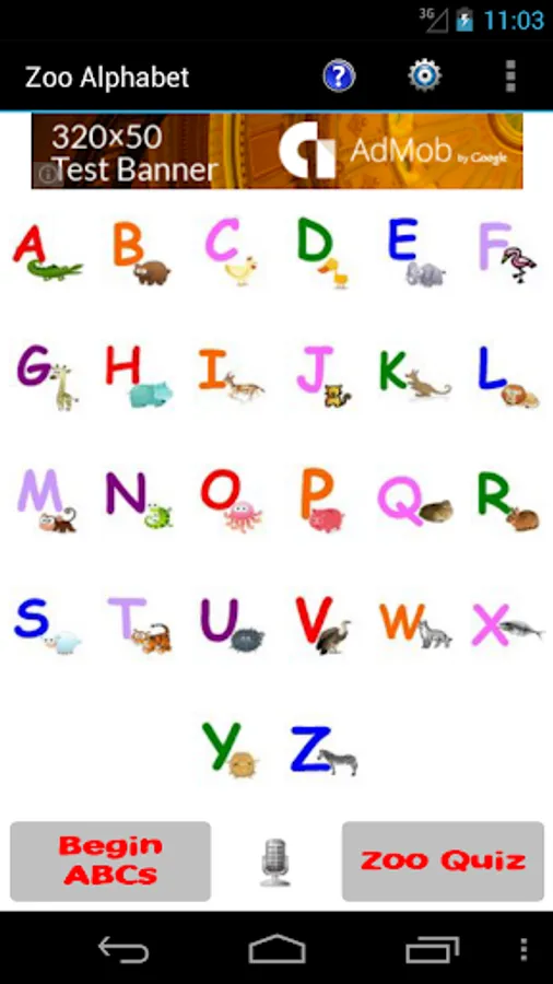The application opens with a welcome and a rendition of the ABC song. The initial start-up screen shows all the letters of the alphabet - the sound of each letter can be heard by pressing the relevant letter (please note that a long press on the letter 'Z' will allow the ABC song to be repeated). The buttons at the bottom of the main screen transfer the application into either ABC mode or Zoo Quiz mode. There is an option to record yourself singing along with the ABC song by pressing the microphone image situated between the 2 buttons at the bottom of the screen - this allows about 25~26 seconds of audio to be recorded (a progress dialogue will be displayed during this time - the recording can be cancelled at any time by pressing the 'Cancel Recording' button on the progress dialogue). After pressing the image, count 1, 2 and the song will start for you to sing along with - the recorded audio can be played back by long pressing the letter 'Y'. If the recording is made when using headphones, the end result will be the recorded voice - if, when recording, headphones are not used, the application's version of the song will also be heard in the background of the finished recording. The ability to record within the application can be turned On or Off in the 'Settings' tab (the default is On). If recording mode is set to Off, long pressing on the letter 'Y' is automatically disabled.
