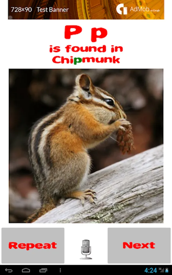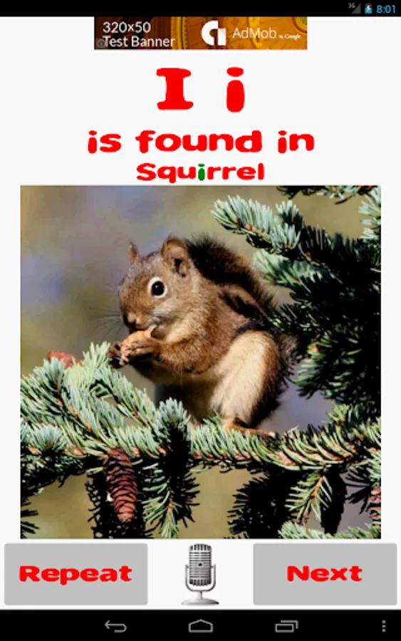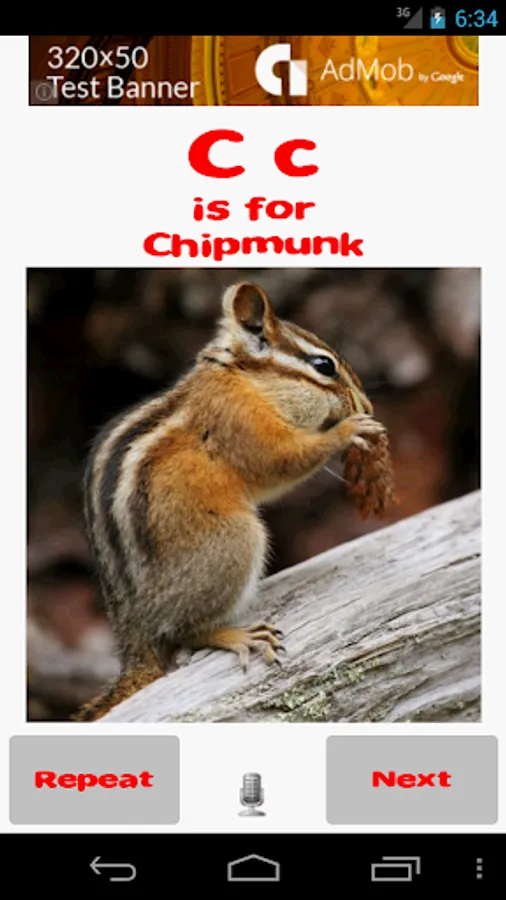 The ABC application can be viewed in two modes - the first mode (the default) displays a word and picture relating the letter to the first letter of the word; the second mode displays a word and picture where the word contains at least one instance of the letter - the choice of modes can be made via the 'Settings' tab in the options menu which can be accessed from the start-up screen. There is an option for the user to record their own voice by pressing the microphone image situated between the 2 buttons at the bottom of the screen - this allows about 10 seconds of audio to be recorded - for example, this function can be used to check the user's pronunciation of the letter and/or name of the pictured animal, bird or fish against that in the application - the recorded audio can be played back by long pressing the 'Repeat' button. The recording for each screen remains available until it is recorded over by a new recording and can be replayed next time the screen appears by long pressing the 'Repeat' button - if recording mode is enabled and no recording has been made for a specific screen, long pressing the 'Repeat' button will result in the application's version of the audio being played. If recording mode is set to Off, long pressing on the 'Repeat' button is automatically disabled.