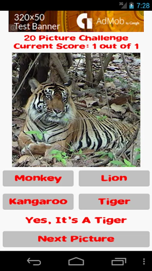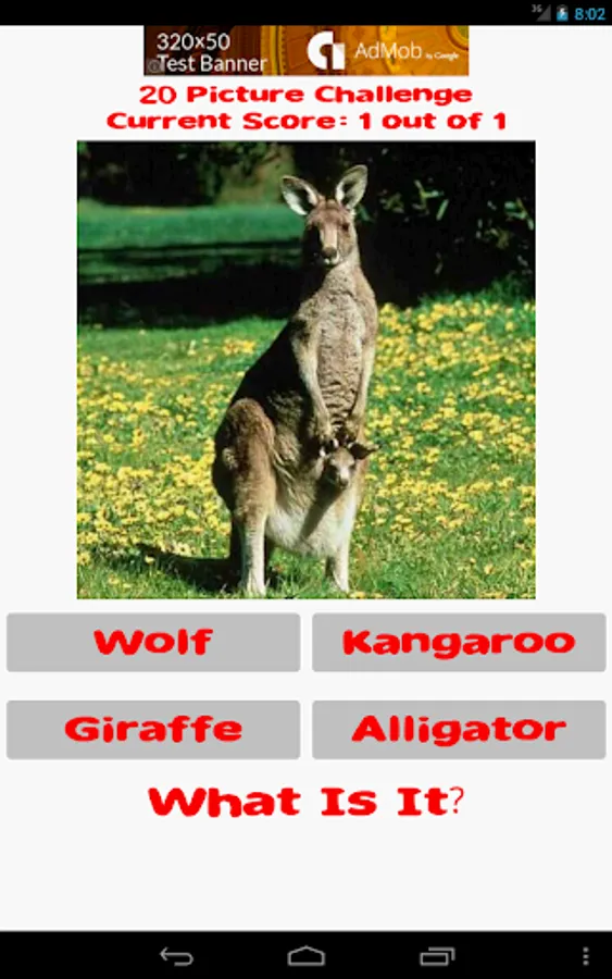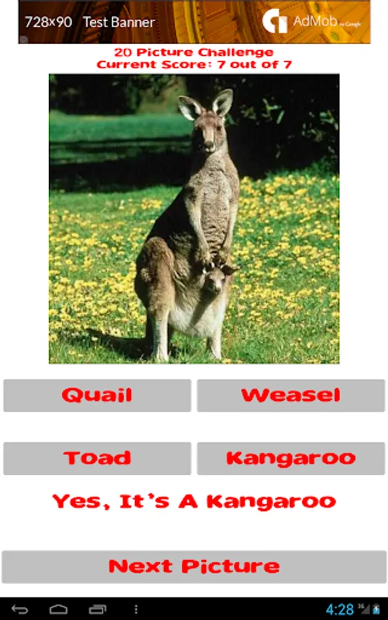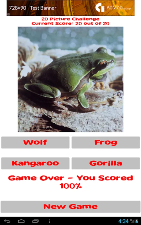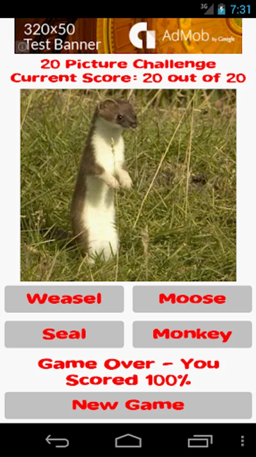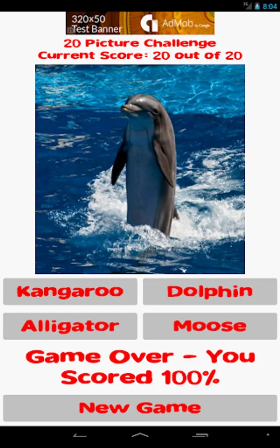 In Zoo Quiz mode, the user enters the name of a pictured animal, bird or fish by pressing the relevant button. The quiz can be set up to include 10, 20, 30, 40 or 50 pictures via the 'Settings' tab (the default is 20 pictures). During the quiz, a running score of correct answers is shown at the top of the screen and a final score is provided to the user at the end of each quiz. Audio in this mode can be set On or Off via the 'Settings' tab (the default is On).