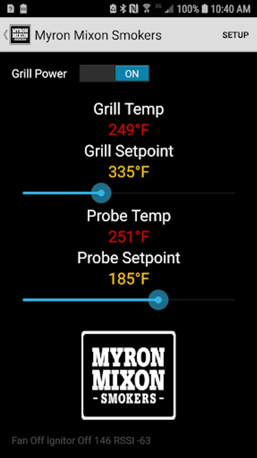 The Myron Mixon Smokers application lets you connect your smoker to your phone or tablet using WiFi. The system requires a custom WiFi adapter wired to the smoker. Once the smoker is found, you can adjust the setpoint temperatures for the burn chamber and the meat probe. This will allow you to monitor the current temperatures of both.