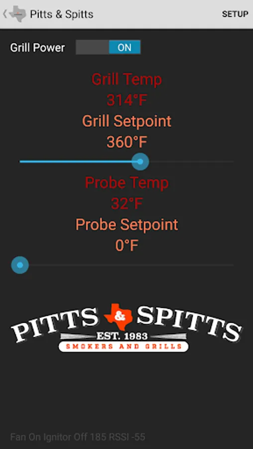The Pitts & Spitts application lets you connect your pellet grill to your phone or tablet using WiFi. The system requires a custom WiFi adapter wired to the grill. Once the pellet grill is found, you can adjust the setpoint temperatures for the burn chamber and the meat probe. This will allow you to monitor the current temperatures of both.