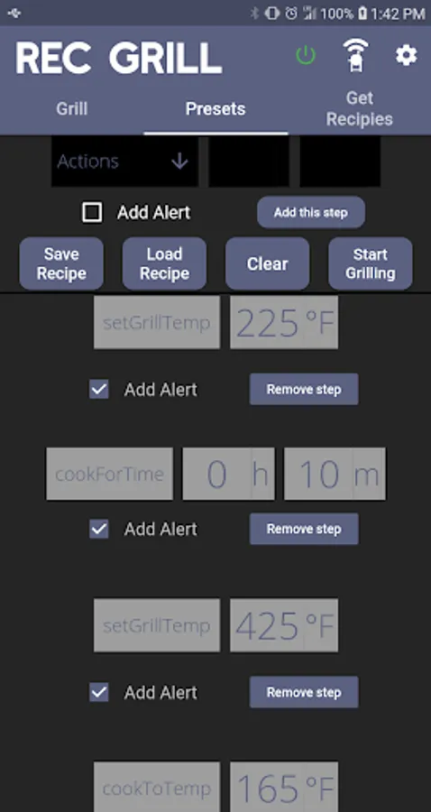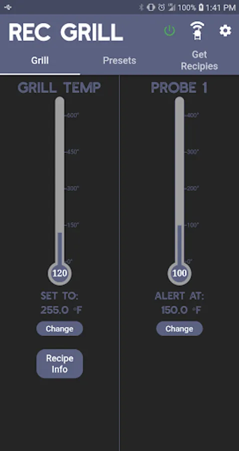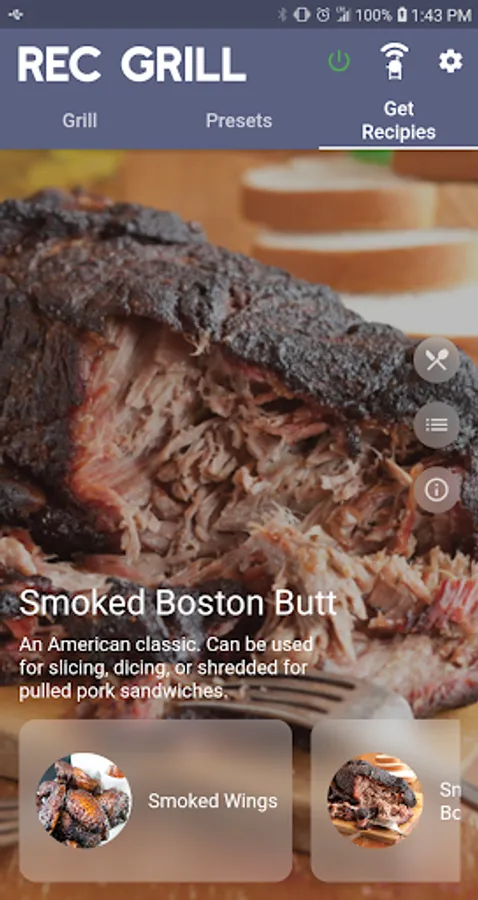 App for controlling REC-associated pellet grills. Use one of our favorite recipes, or make your own! This app will allow you to control your grill over WiFi, and it will also show you the grill's temperature and the readings of any connected probes in real time.