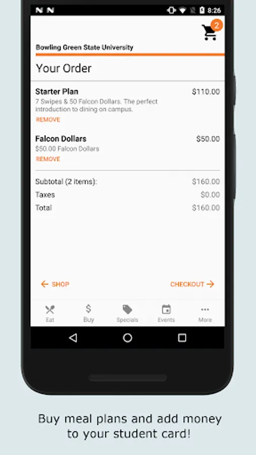 In addition to menus, you can purchase meal plans, build a custom plan, or add declining balance to your student card, depending on which options are available on your campus.