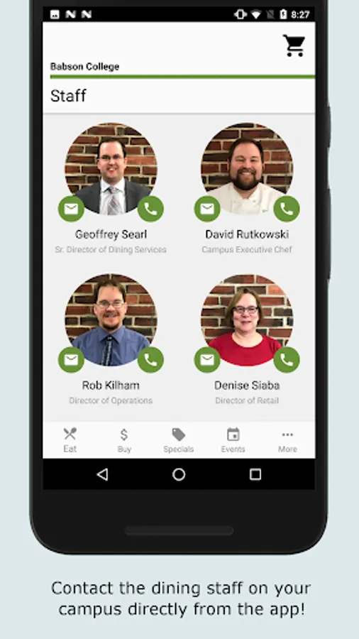 If you have questions or comments regarding dining service on your campus, you can contact our dining staff directly through the app by tapping on the email or phone icon associated with each staff profile.