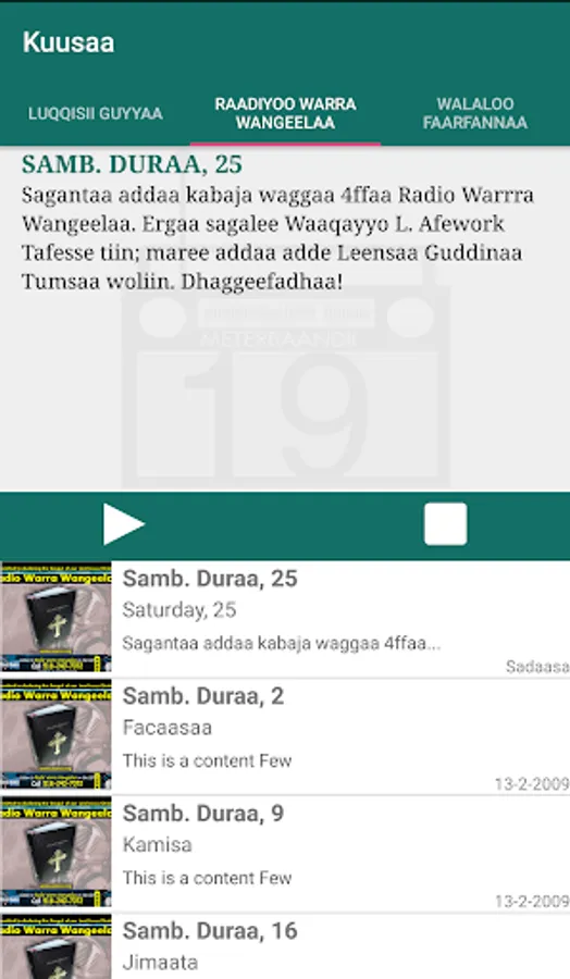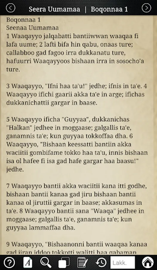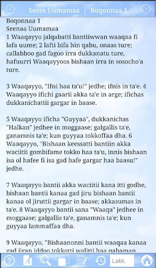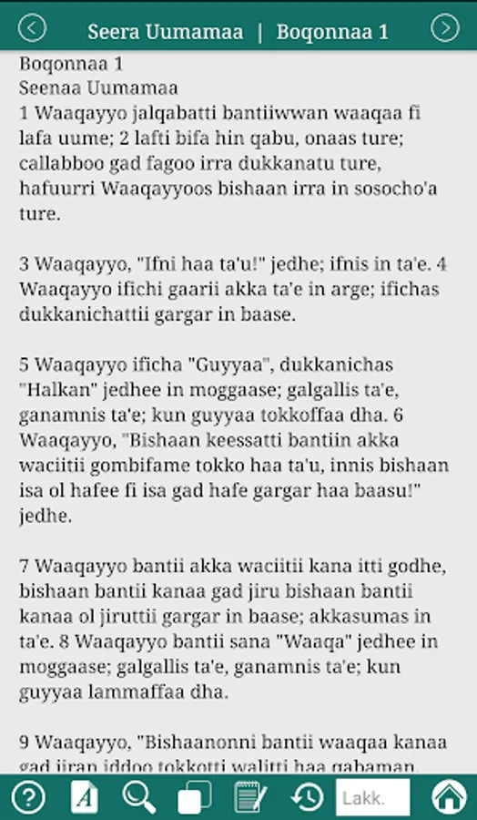 Nearly 120 years after the translation of bible into Afan Oromo by Onesmus Nesib and the first printed Afaan Oromoo Bible on paper, the way people reads Holy Bible changed radically. Now a days, almost everybody uses mobile devices to read the bible. Taking into consideration this fact, we offer this trendy Bible app for your android device. Install on your android device and take it with you wherever you go and enjoy your bible!