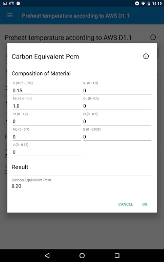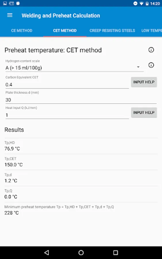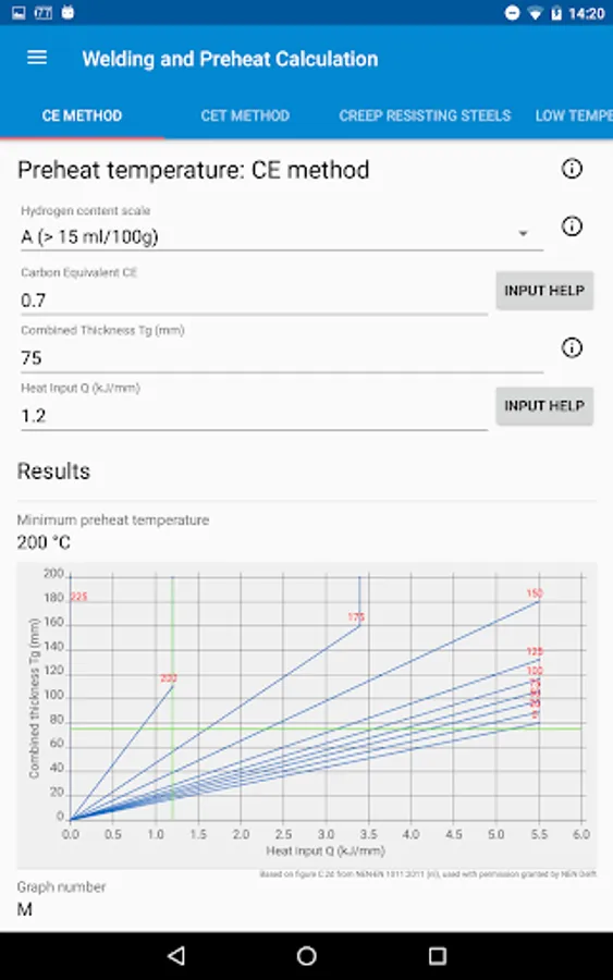 Use this app to calculate preheat temperature and other useful measures based on both the EN-1011-2 and AWS D1.1 standards. The included graphs and information snippets help you to gain insight in how the calculations work and how changes in input values influence the results.