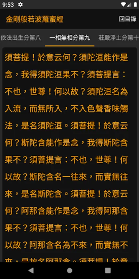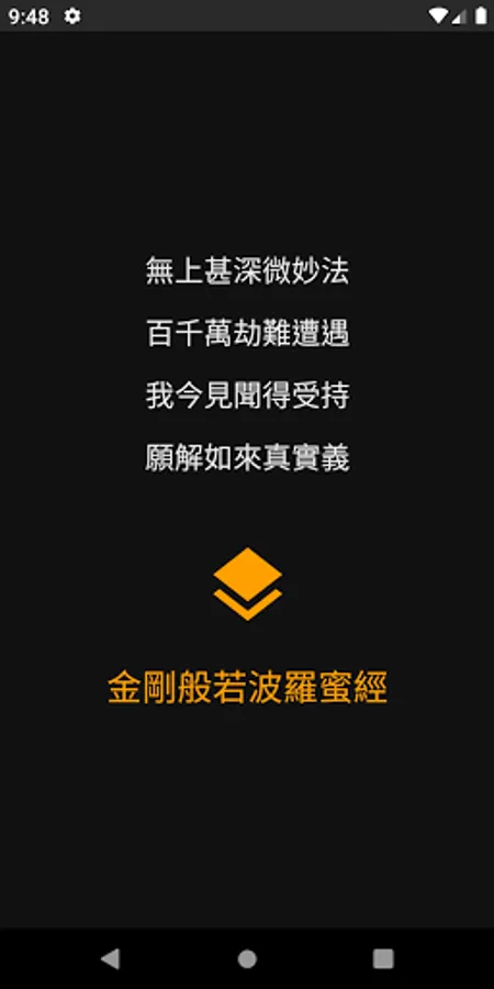 On the home page, swipe up and down the screen to select the chapter you want to read. In the chapters, slide the screen left and right to reach the previous and next chapters. This app is silent and designed purely for meditation reading.